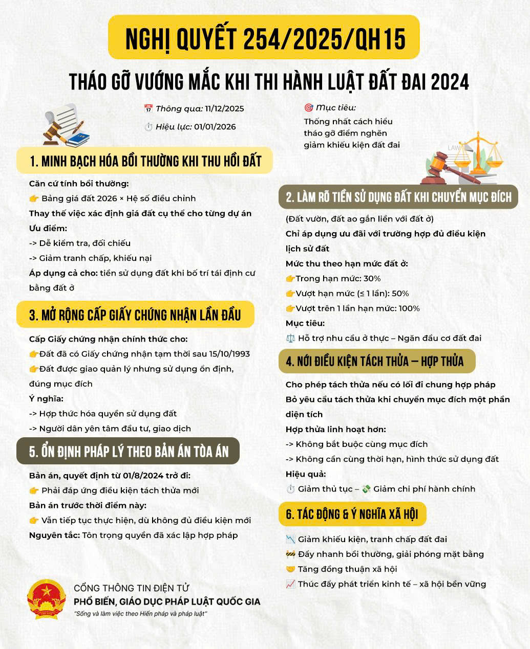 Nghị quyết 254/2025/QH15 ngày 11/12/2025 của Quốc hội quy định một số cơ chế, chính sách tháo gỡ khó khăn, vướng mắc trong tổ chức thi hành Luật Đất đai có hiệu lực từ ngày 01/01/2026, đóng vai trò là “chìa khóa” pháp lý giúp thống nhất cách hiểu, cách làm giữa các địa phương, hạn chế tình trạng lúng túng, áp dụng không đồng đều trong thời gian qua.