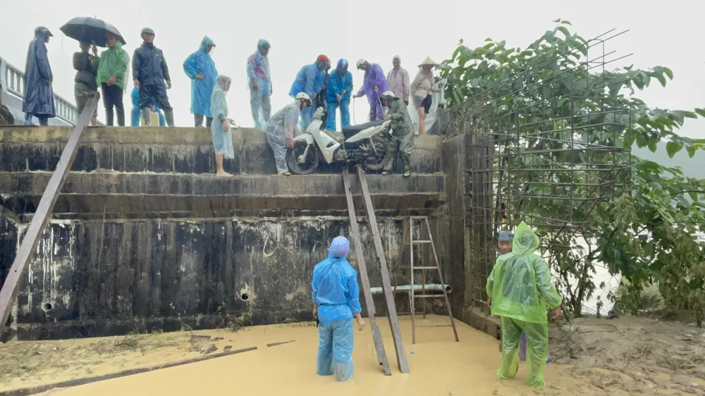 Người dân giúp nhau đưa xe máy lên cầu để ra khỏi vùng cô lập. Ảnh: H.T