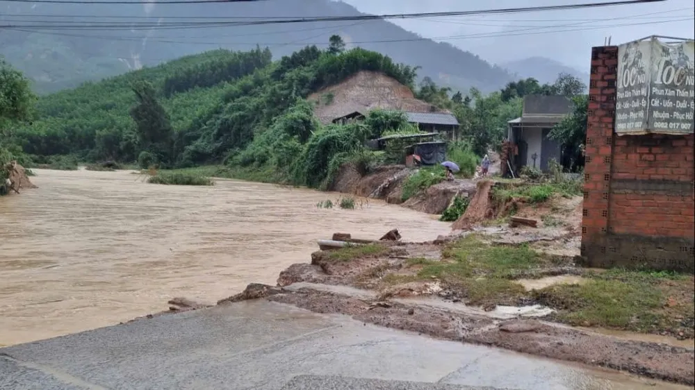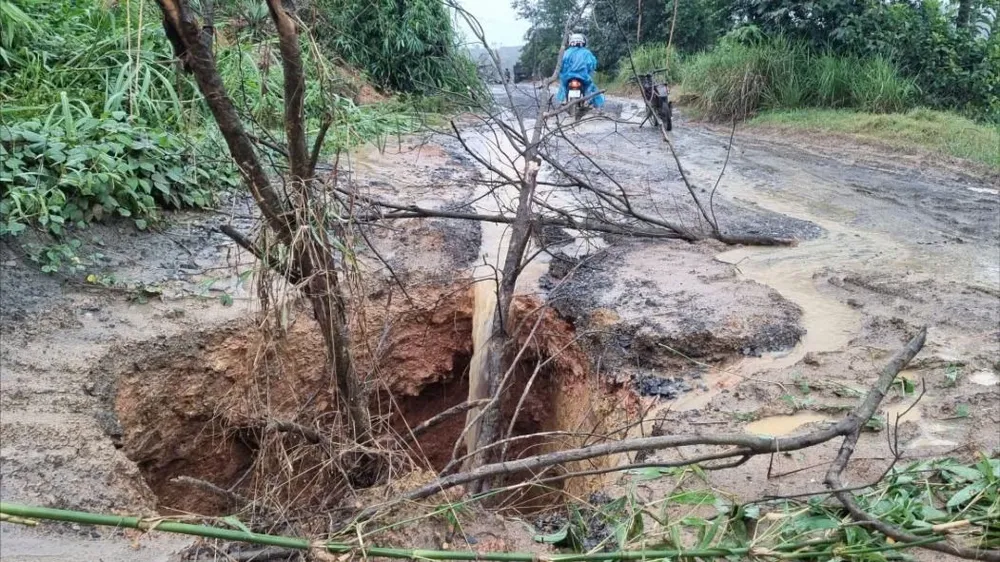 Mưa lũ tạo thành hố sâu trên đường. Ảnh: T.T