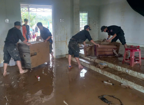 CBCS Phòng Cảnh sát cơ động Công an tỉnh Đắk Lắk thu dọn vệ sinh, tẩy rửa bùn đất một công sở hành chính ở thôn Phú Hữu, xã Hòa Thịnh.