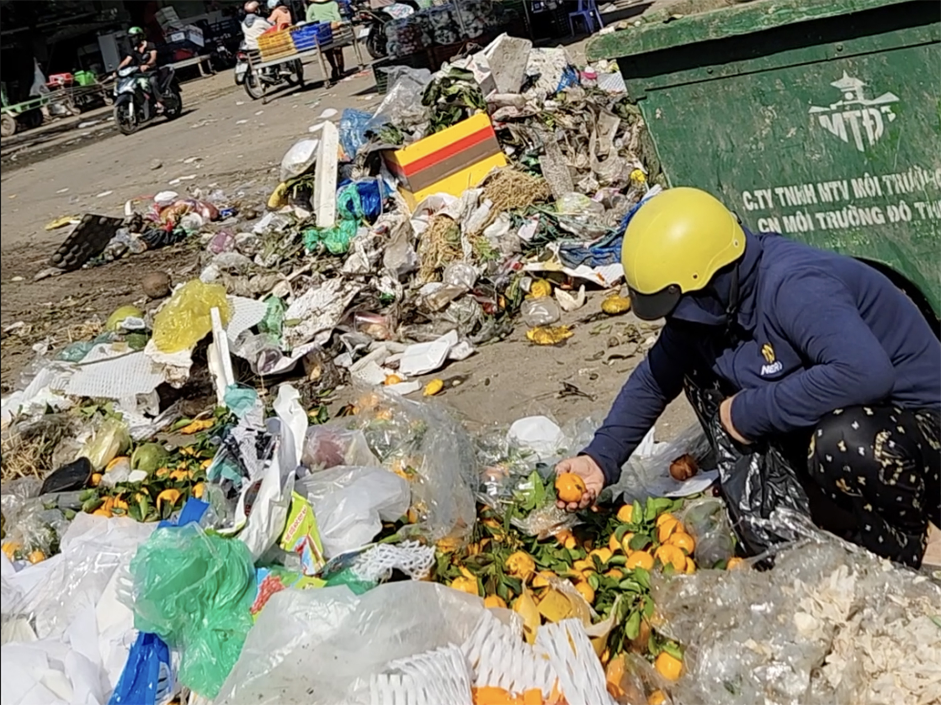 Quy trình này tương tự với những người nhặt rau củ hàng dạt khác, từ tắc (quất), đu đủ, cam, quýt, táo... Qua quan sát, chúng tôi thấy một phụ nữ đi xe tay ga biển số 61-xxxx dành 15-20 phút lựa chọn từng trái quýt đỏ ê hề trên mặt đất, những quả hư hỏng hoặc vỡ đều bỏ lại bãi rác.