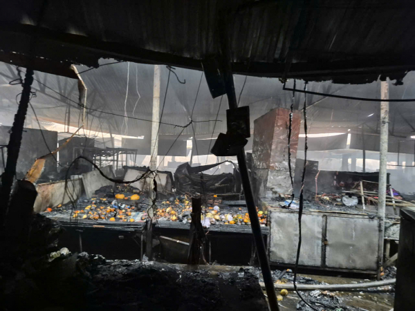 Hàng hóa tại các gian hàng bên trong chợ đều cháy rụi, chỉ còn lăn lóc một số hoa quả trên sạp.
