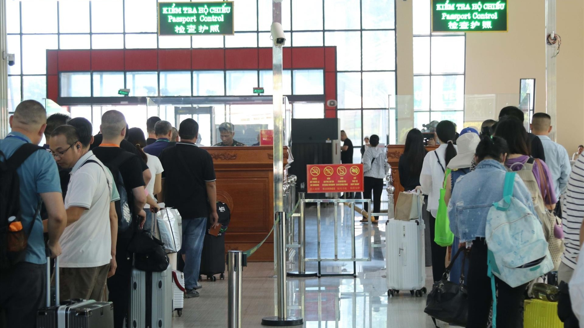 Hành khách xếp hàng làm thủ tục xuất nhập cảnh tại Cửa khẩu quốc tế Hữu Nghị (Lạng Sơn). (Ảnh: TTXVN)