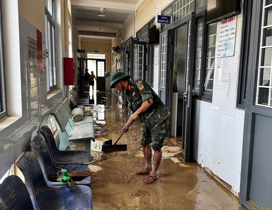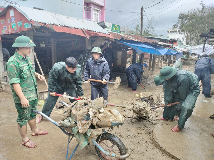 Tại Bệnh viện Lao và Bệnh phổi Quy Nhơn và Bệnh viện Tâm thần Quy Nhơn (hai cơ sở chịu thiệt hại nặng nề do ngập sâu), lớp bùn đất đặc quánh phủ kín cả tầng 1. Những ngày qua, hơn 100 cán bộ, chiến sĩ Trung đoàn 739 (Bộ CHQS tỉnh) đã được điều động về đây để dốc sức hỗ trợ dọn dẹp vệ sinh sau mưa lũ.