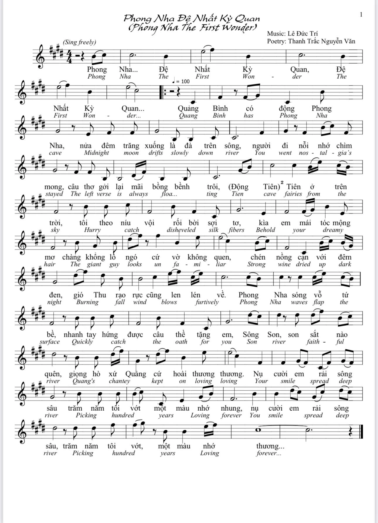 Nhạc sĩ Lê Đức Trí cho hay: Đọc bài thơ “Tạm biệt Phong Nha” tôi cảm nhận được tình cảm của tác giả dành cho địa danh du lịch này nên đã liên hệ xin phổ thơ thành ca khúc có tên “Phong Nha đệ nhất kỳ quan” mang âm hưởng ca trù. Ngay từ khi ra đời, ca khúc nhanh chóng nhận được sự đón nhận của công chúng, được nhiều ca sĩ tên tuổi thể hiện và đạt giải B tại Cuộc vận động sáng tác văn học nghệ thuật nhân dịp kỷ niệm 420 năm hình thành tỉnh Quảng Bình (cũ). Ca khúc còn được dịch sang tiếng Anh với mong muốn lan tỏa hình ảnh, vẻ đẹp của vùng đất và con người nơi đây đến với bạn bè quốc tế.