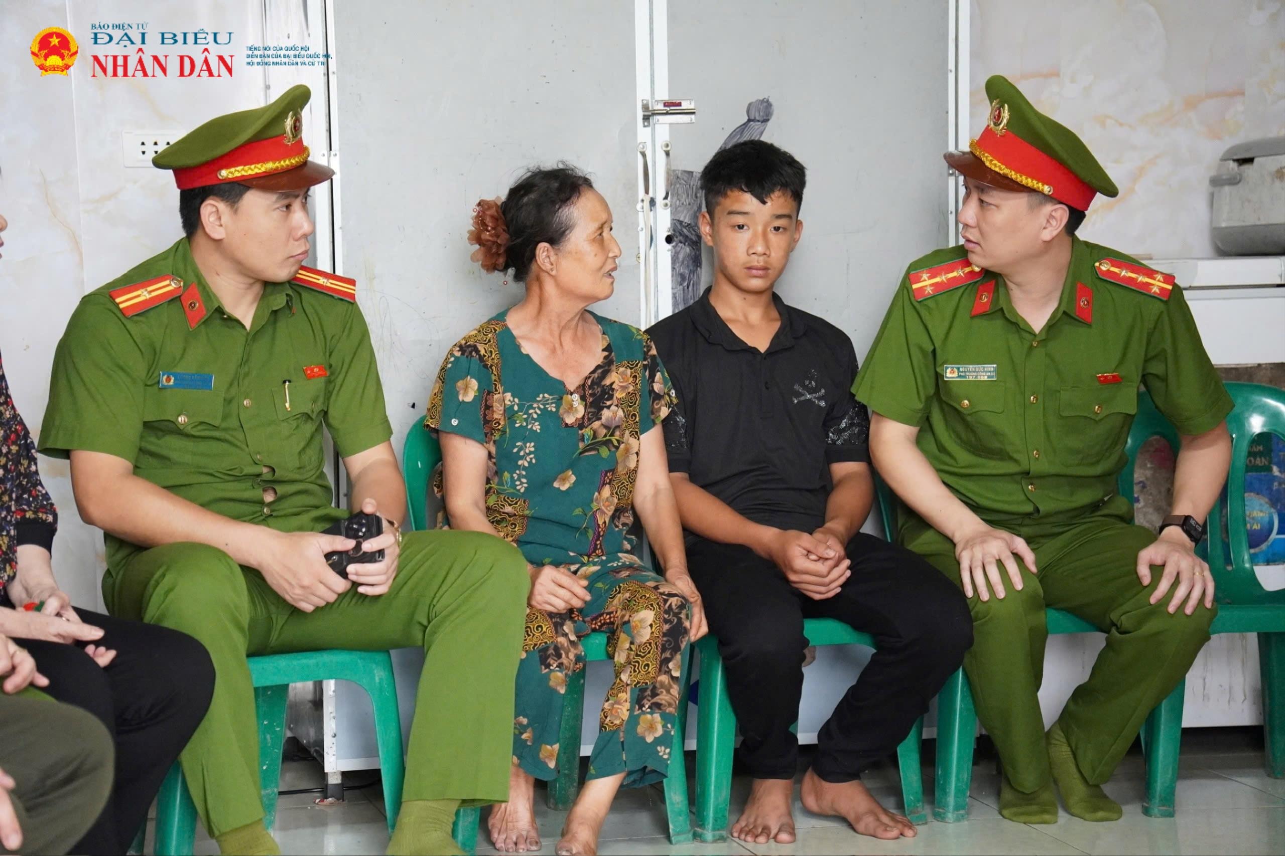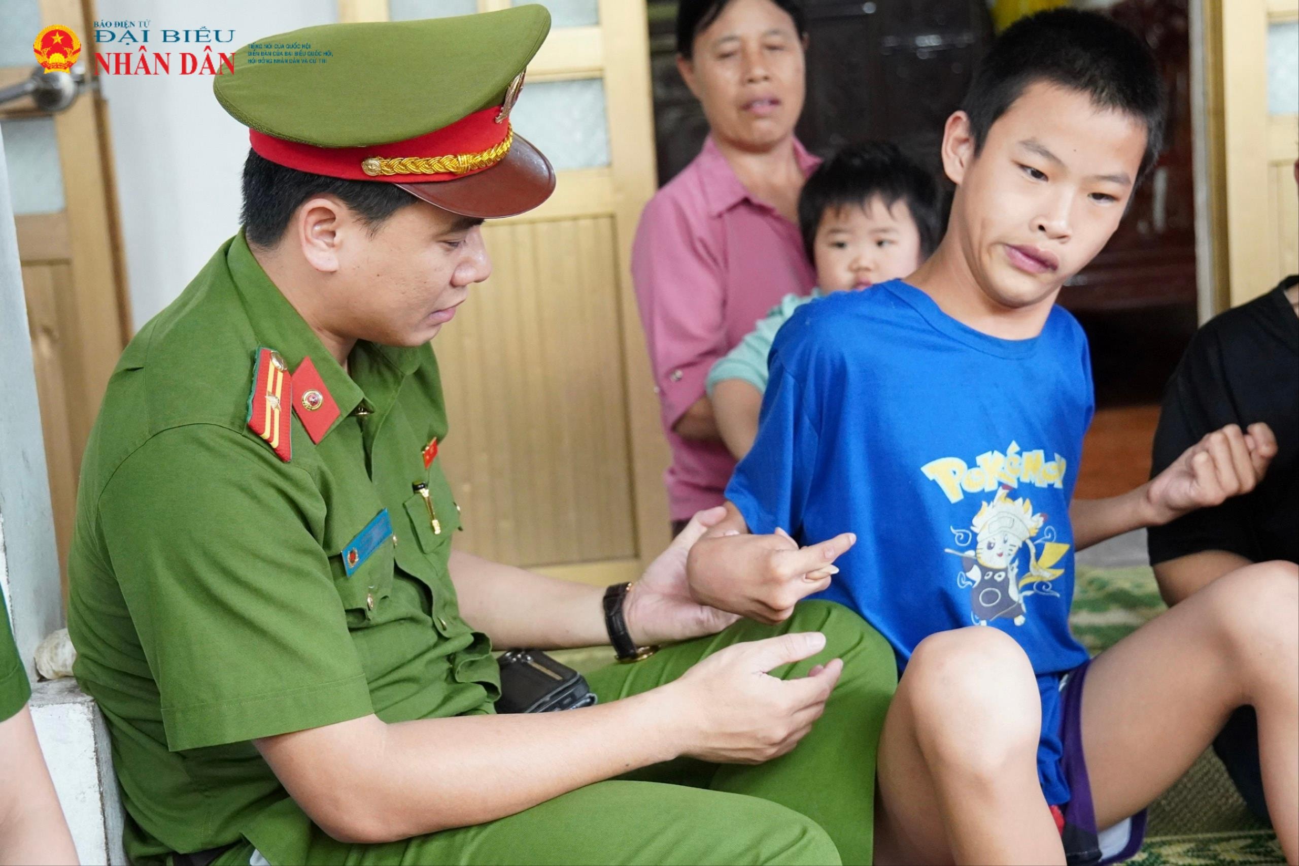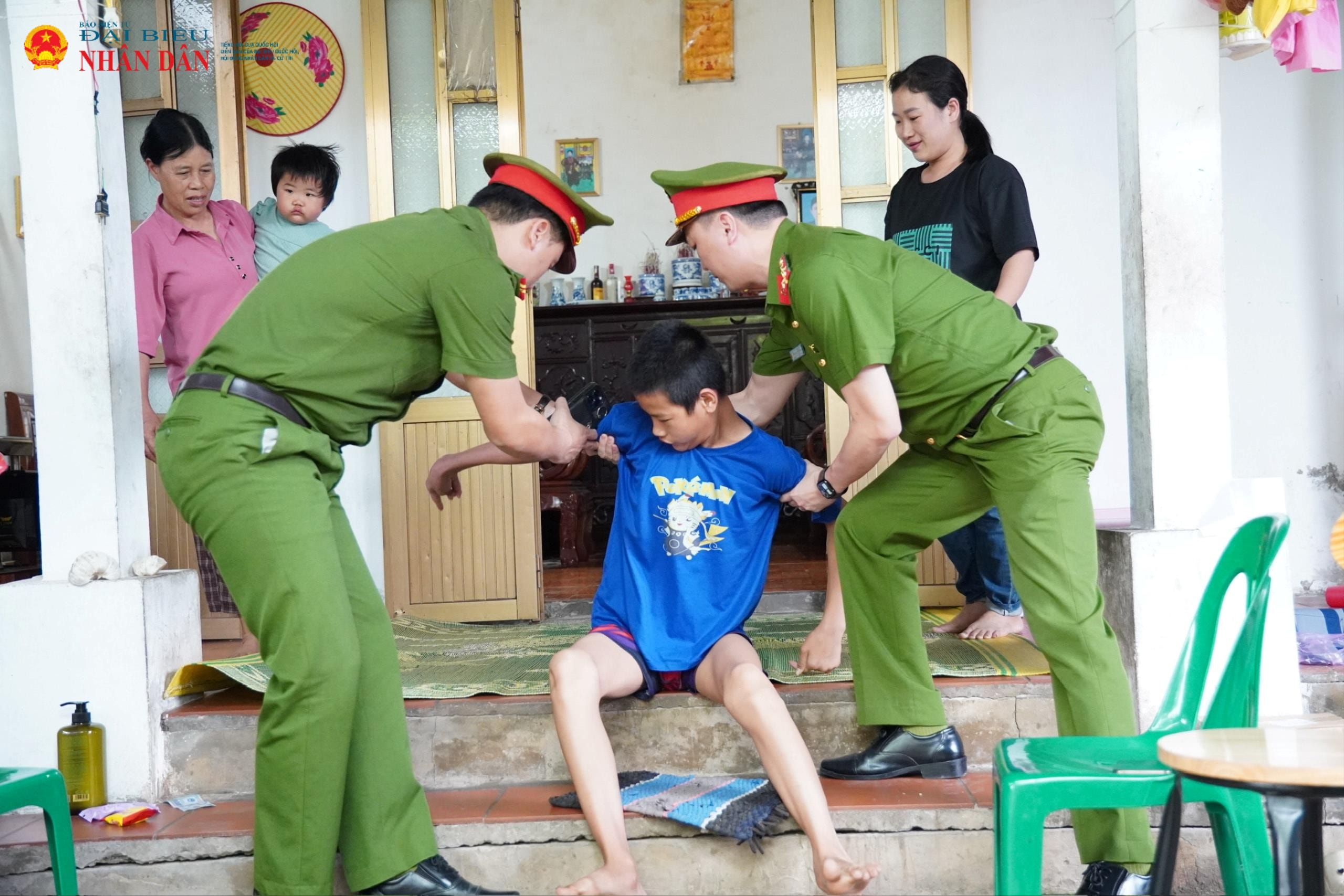 Hai đồng chí Phó Trưởng Công an xã – Thiếu tá Lương Văn Kiên và Đại úy Nguyễn Đức Hinh – kịp thời đỡ em Thắng khi em bất ngờ trượt ngã ở hiên nhà do không kiểm soát được hành vi.