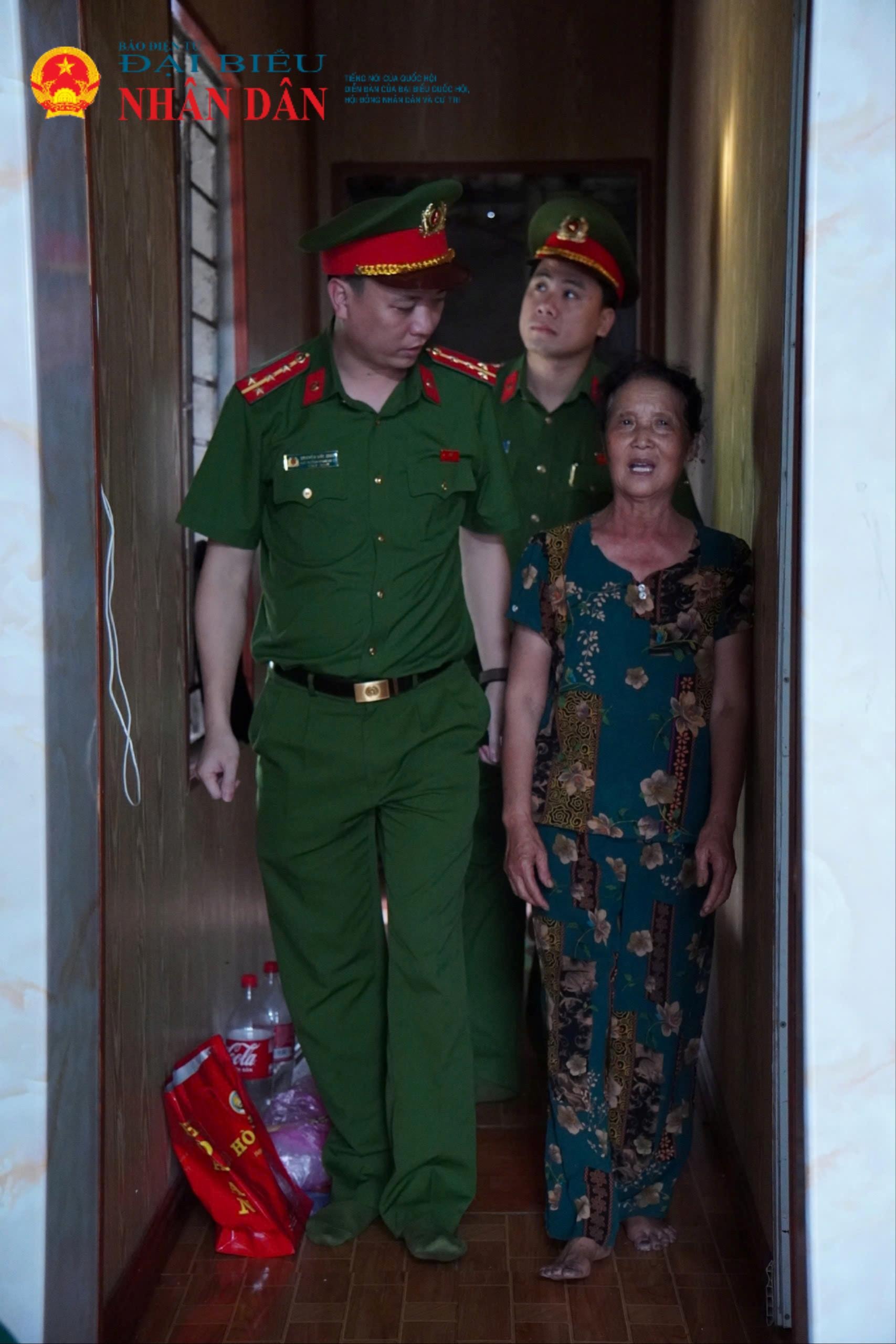 Các đồng chí cán bộ, chiến sĩ Công an xã Đại Xuyên đi một vòng ngôi nhà hai bà cháu để xem điều kiện vật chất có đảm bảo trong việc sinh hoạt, học hành hay không.