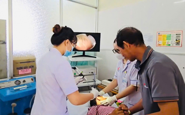 Ê kíp nội soi "dọn" ổ ấu trùng trong tai bệnh nhân.