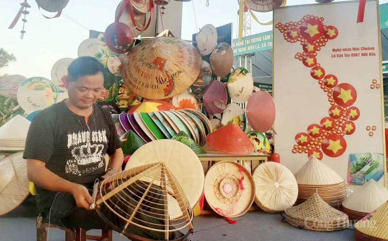 Nghệ nhân Lê Văn Tuy, chủ Cơ sở nón lá Lê Văn Tuy (xã Thanh Oai, Hà Nội) trình diễn nghề tại Triển lãm quảng bá, giao thương kết nối sản phẩm OCOP, thủ công mỹ nghệ, làng nghề phục vụ du lịch xã Thanh Oai. Ảnh: N.H