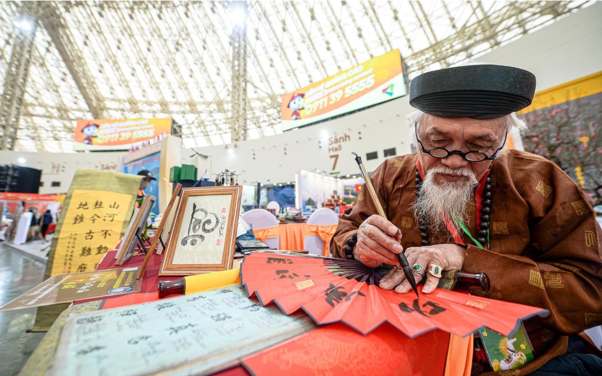 Nghệ nhân cao tuổi viết thư pháp tại Hội chợ.