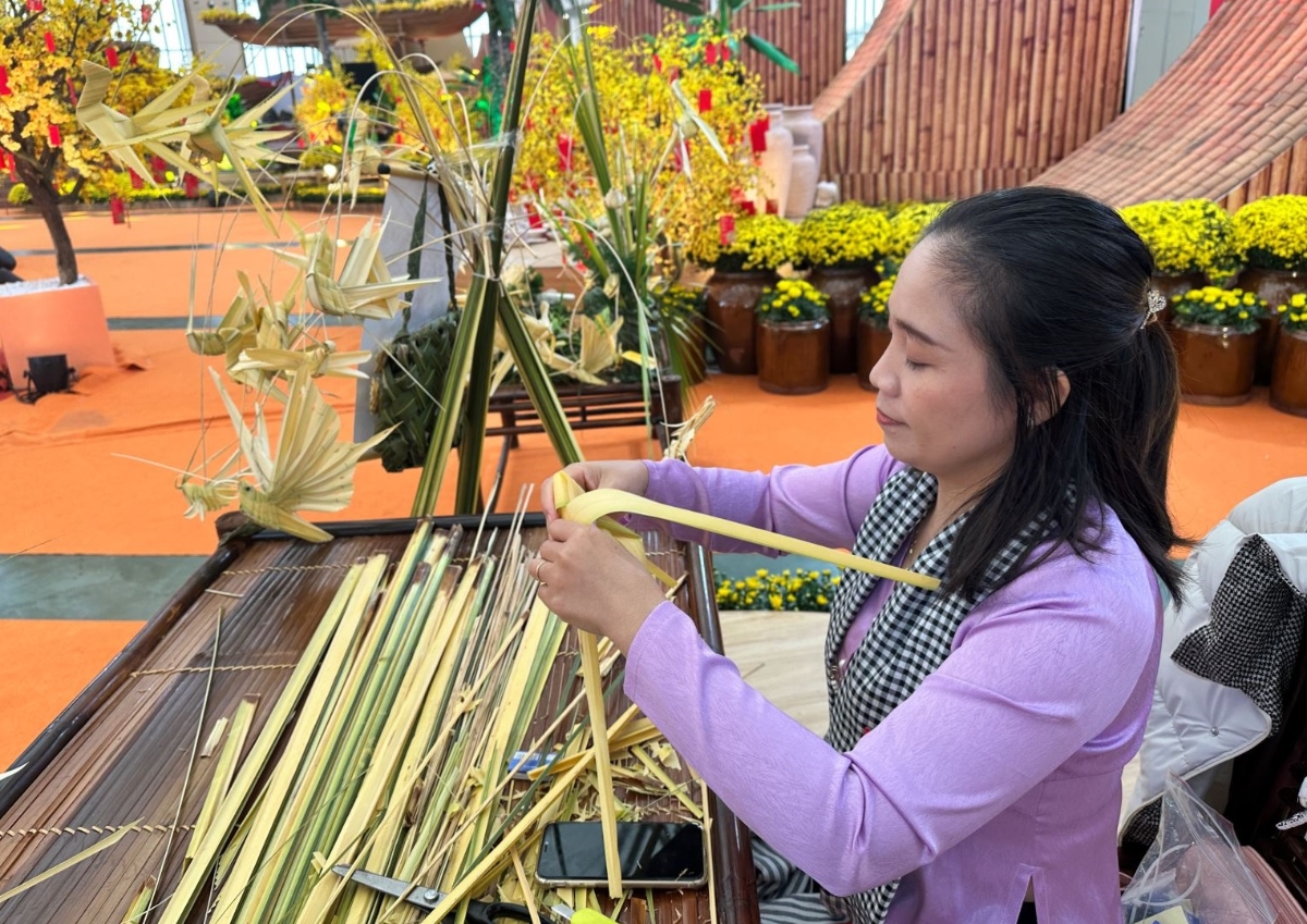 Tại gian hàng của các tỉnh Nam Trung Bộ, từ những chiếc lá dừa mộc mạc, giản dị, các nghệ nhân đã khéo léo tạo nên những sản phẩm thủ công tinh tế, mang đậm bản sắc quê hương, như hình con rồng, con công, bông hoa hồng,...