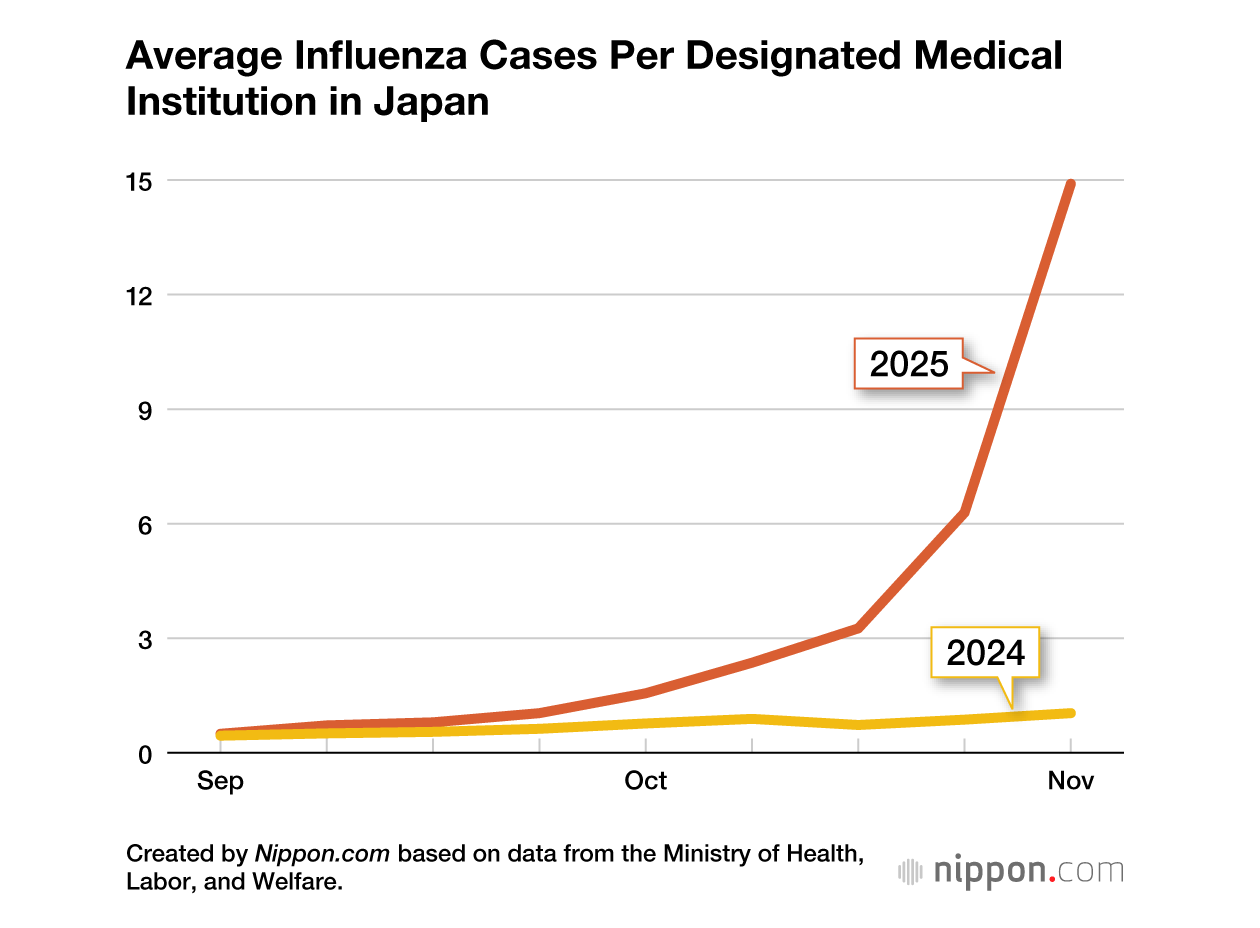 Tại Nhật Bản, tình hình thậm chí còn nghiêm trọng hơn. Số ca cúm ở Tokyo hiện cao gần gấp sáu lần so với cùng thời điểm năm ngoái. Đài Nippon TV đưa tin, hơn 2.300 trường học và cơ sở chăm sóc trẻ em buộc phải tạm đóng cửa một phần nhằm ngăn chặn sự lây lan trong cộng đồng. Các chuyên gia Nhật Bản cảnh báo, sự bùng phát sớm của cúm có thể khiến hệ thống y tế chịu thêm áp lực, đặc biệt trong bối cảnh nước này vẫn đang đối phó với các bệnh đường hô hấp khác.