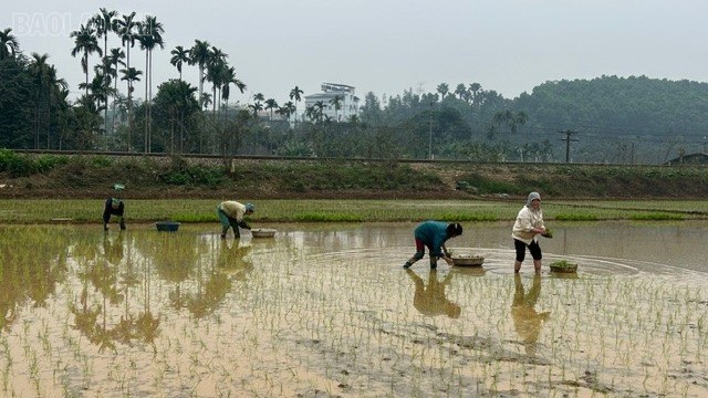 Ngày mùng 4 Tết, nông dân phường Văn Phú ra đồng gieo cấy lúa xuân