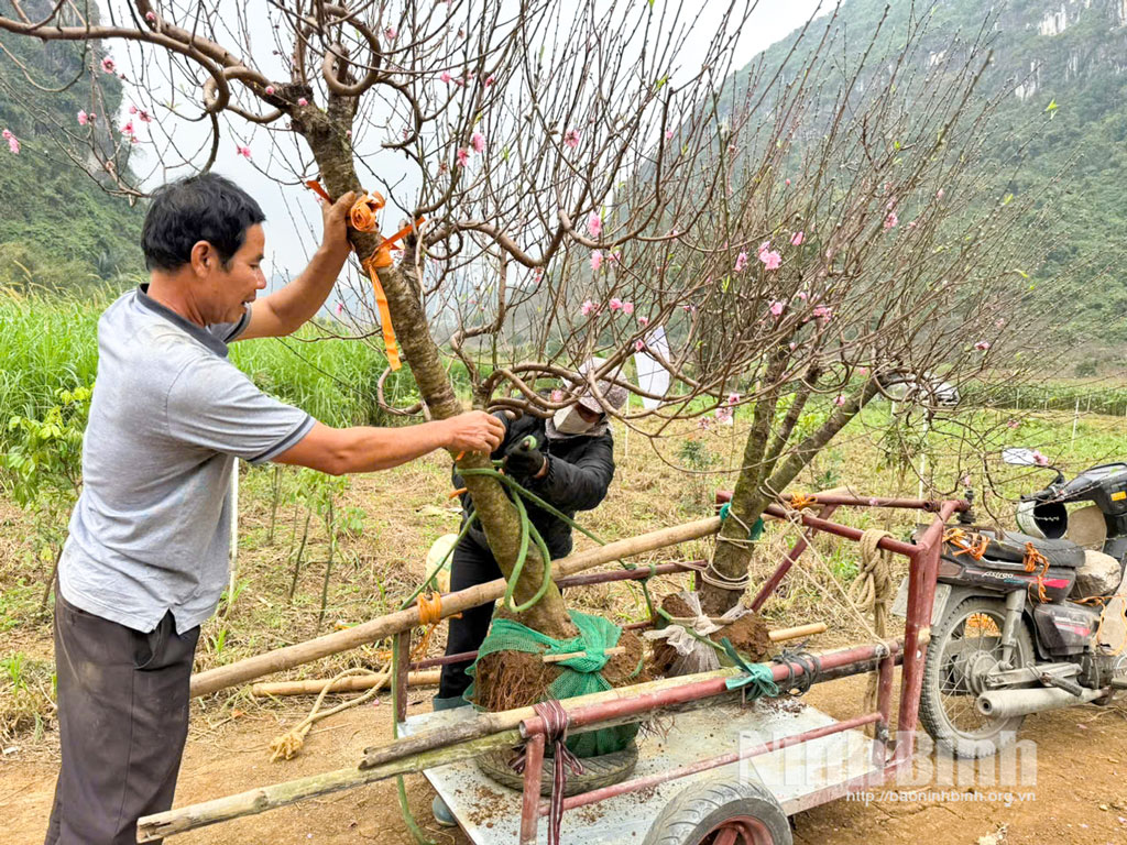 Để đáp ứng nhu cầu của khách hàng, nhà anh Đô đã thuê anh Phùng Gia Phát là thợ giỏi tại địa phương phụ trách chính trong chăm sóc vườn đào. Cặm cụi đánh bầu một gốc đào thế cho thương lái, anh Phát cho biết, đợt cao điểm bán đào Tết, anh được thuê với giá 500.000 đồng một ngày. Nhiệm vụ của anh là trông coi vườn đào, đánh bầu các gốc đào cho thương lái hoặc khách đến mua. Mặt khác, đây cũng là thời điểm các hộ dân thu mua dần các gốc đào cũ về chăm sóc, đòi hỏi người dân phải tạo luống, chăm sóc cây non, ghép mắt chuẩn bị cho vụ sau, nên công việc của anh Phát sẽ kéo dài qua Tết. Anh Phát chia sẻ: “Công việc tuy nặng nhọc, ăn nghỉ ngay tại vườn, nhưng rất vui bởi người nông dân như chúng tôi đã quen với ruộng vườn. Công việc này cũng đem lại thu nhập cao, rất bõ công sức nên chúng tôi rất phấn khởi”.