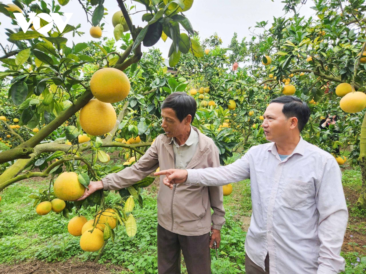 Ông Trần Đình Én ở tổ dân phố Tân Trường, phường Chũ, tỉnh Bắc Ninh giới thiệu giống bưởi tới tiểu thương để chốt đơn hàng