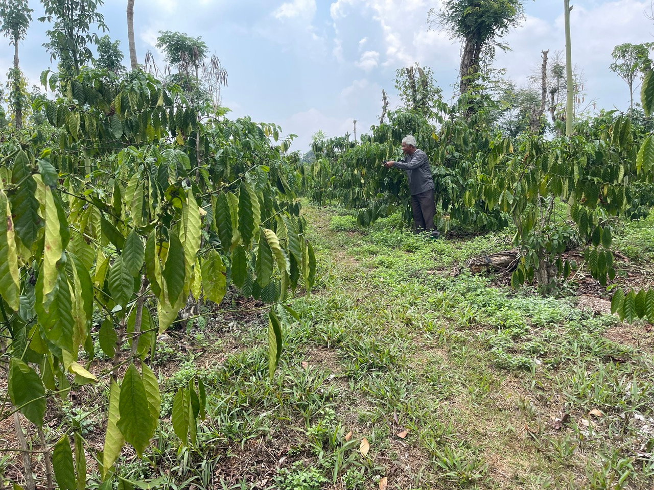 Vườn cà phê của ông Nông Văn Đến dù vừa được tưới xong đợt 3 nhưng vẫn bị héo úa do nắng nóng