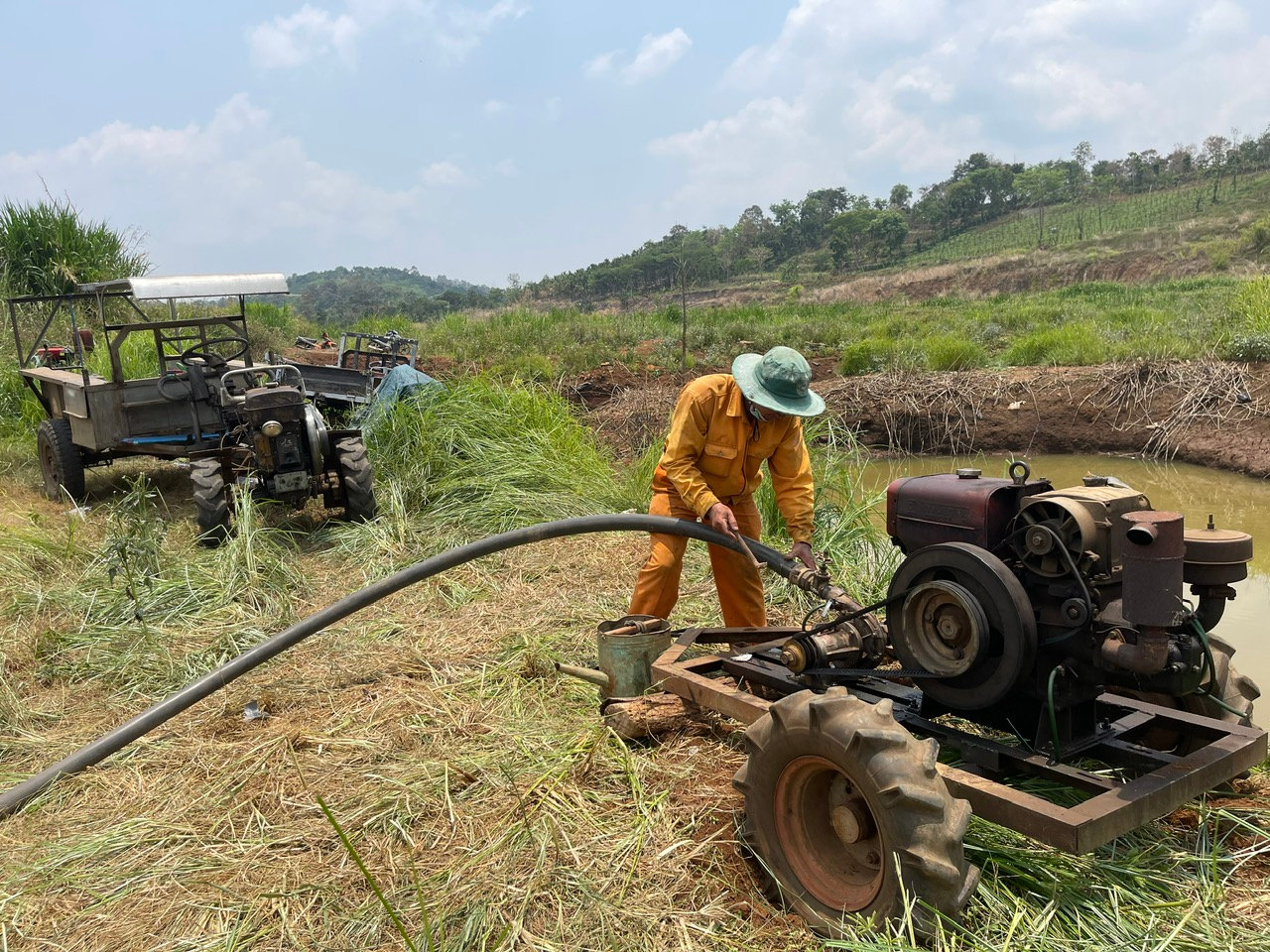 Người dân xã Thuận An đặt máy bơm ngay lòng hồ 40 để bơm hút những vũng nước ít ỏi còn lại