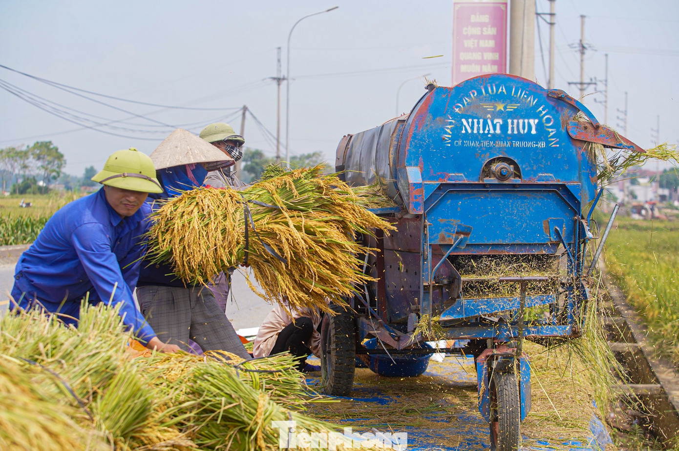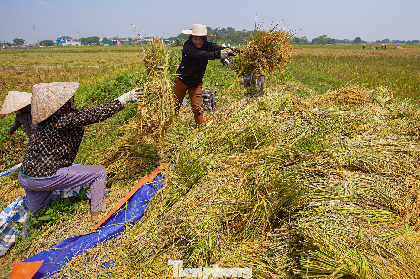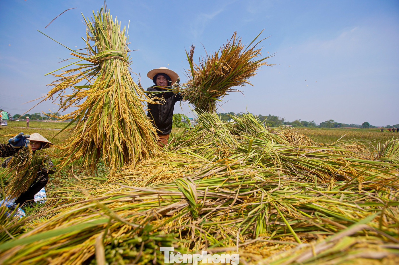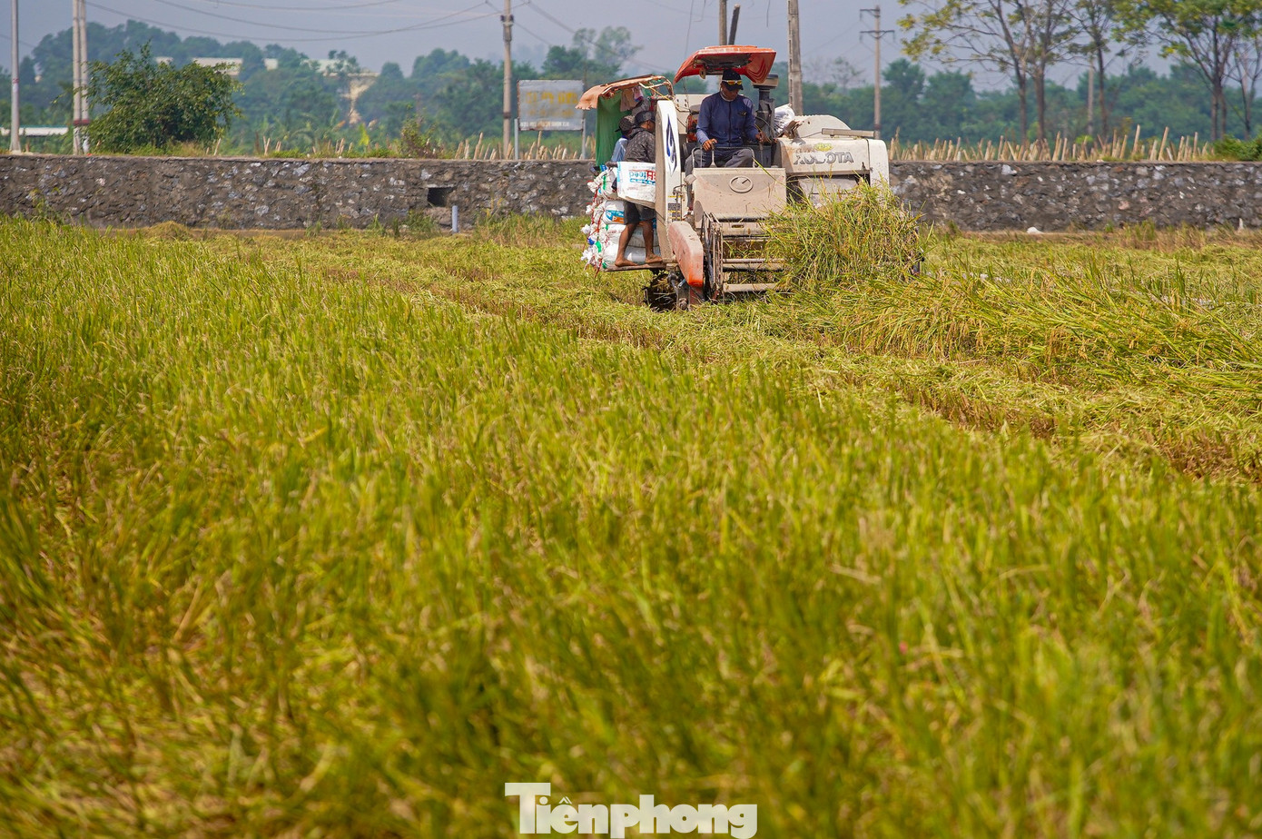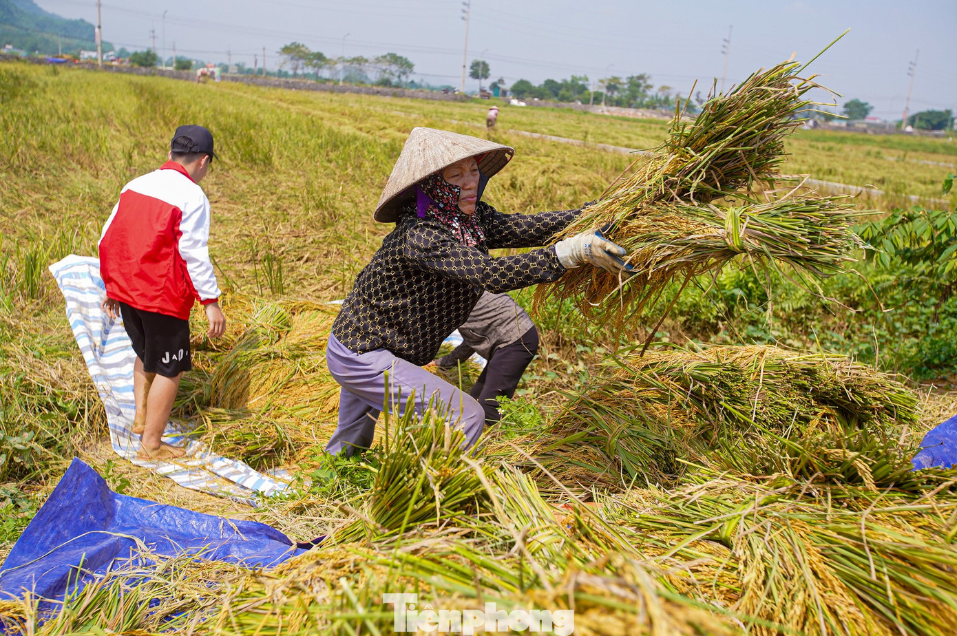 Người dân thôn Phương Hạnh (xã Xuân Mai, Hà Nội) cho biết, sau cơn bão số 10, hàng nghìn hecta lúa bị ngập úng, gãy đổ, vì vậy nên bà con khẩn trương thu hoạch lúa để tránh thiệt hại do bão số 11 gây ra.