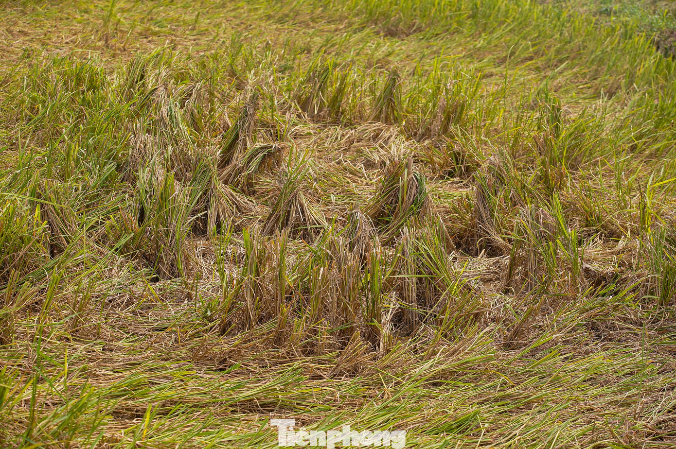 Nhiều cây gãy đổ không thể gặt máy, phải gặt bằng lưỡi liềm.
