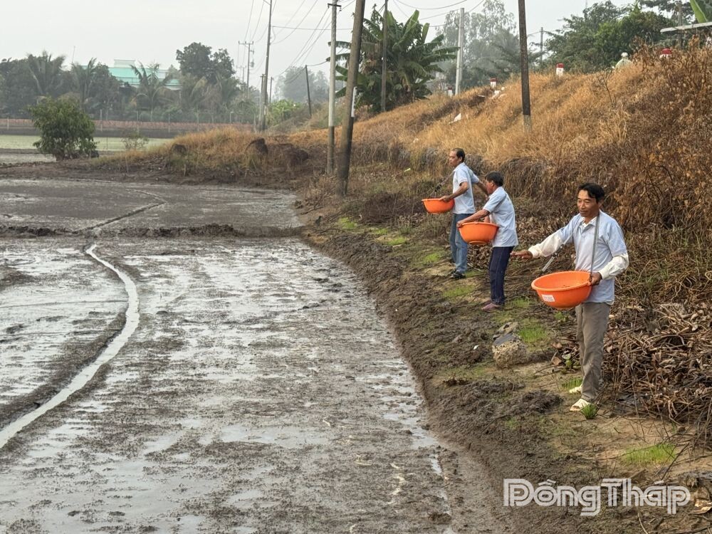 Đại biểu và nông dân chuẩn bị gieo sạ tại cánh đồng ô bao số 52, ấp Cà Dâm, xã Tràm Chim.