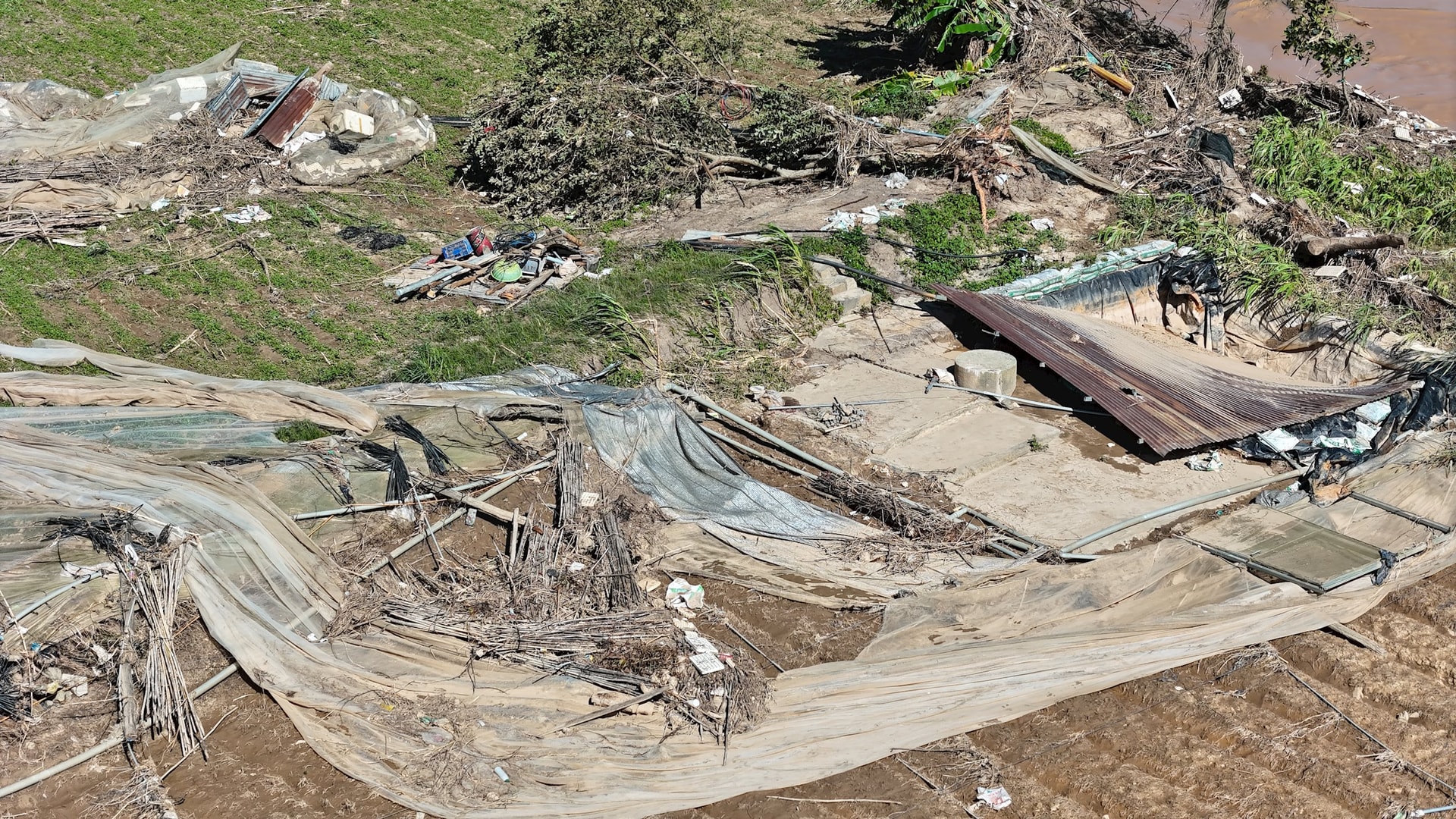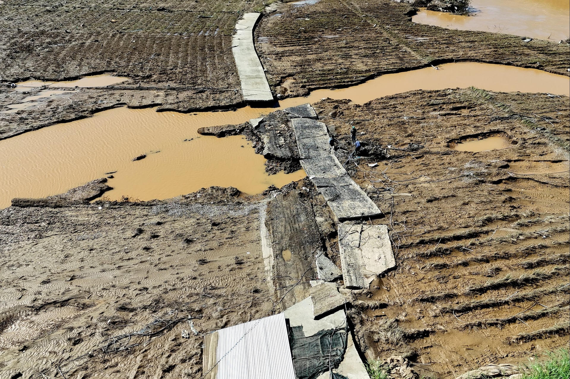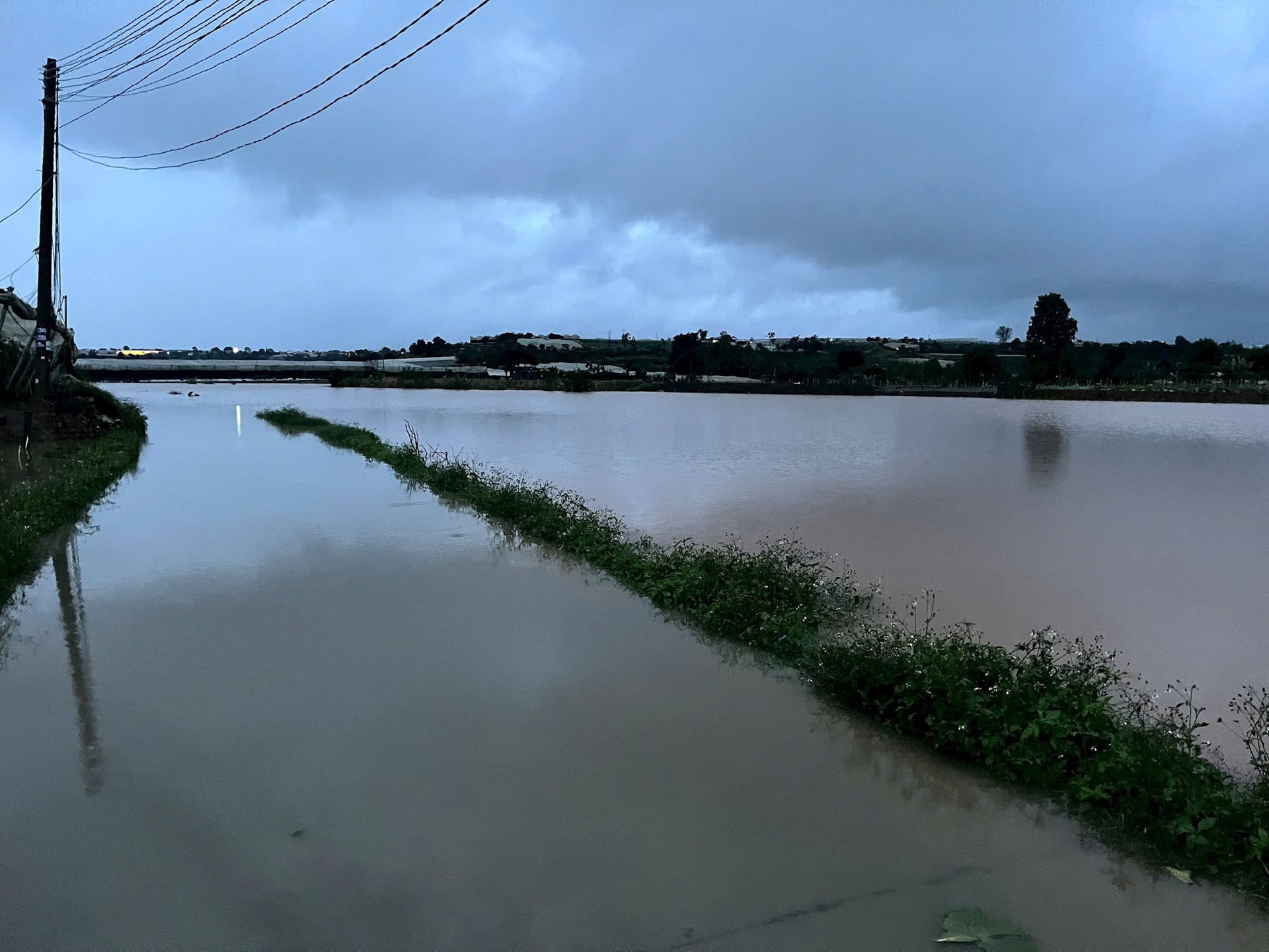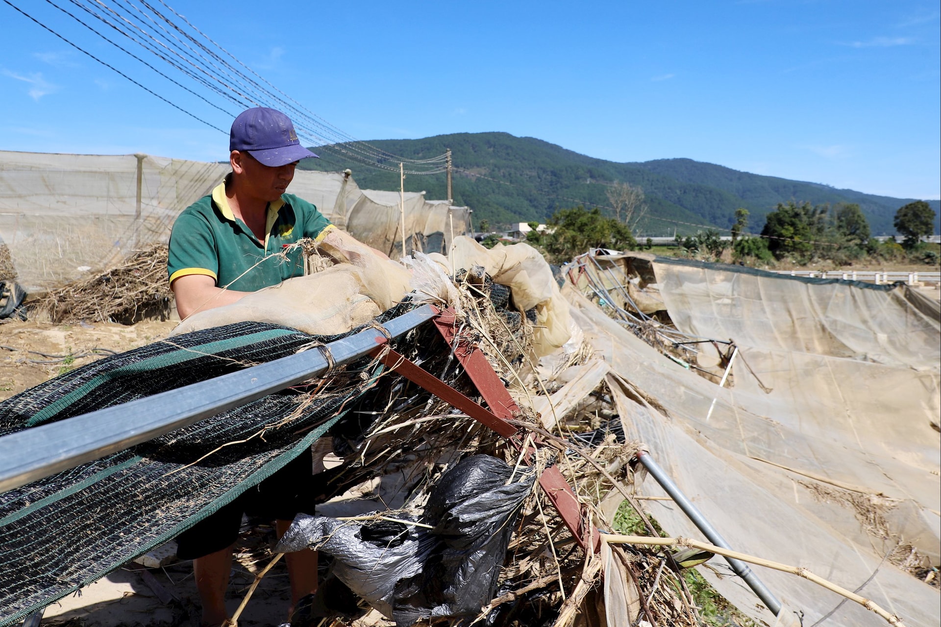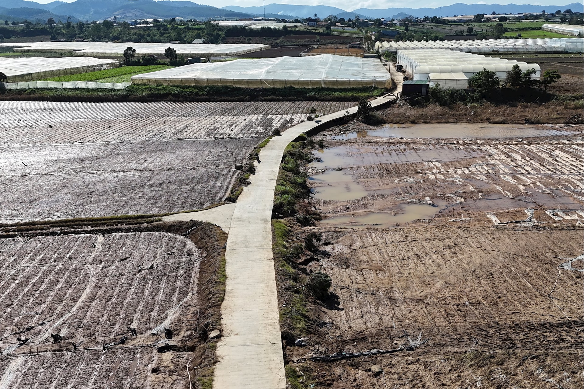 Tuyến đường nội đồng, cũng như hàng loạt nhà kính, nhà lưới của người dân bị lũ làm thiệt hại, hư hỏng