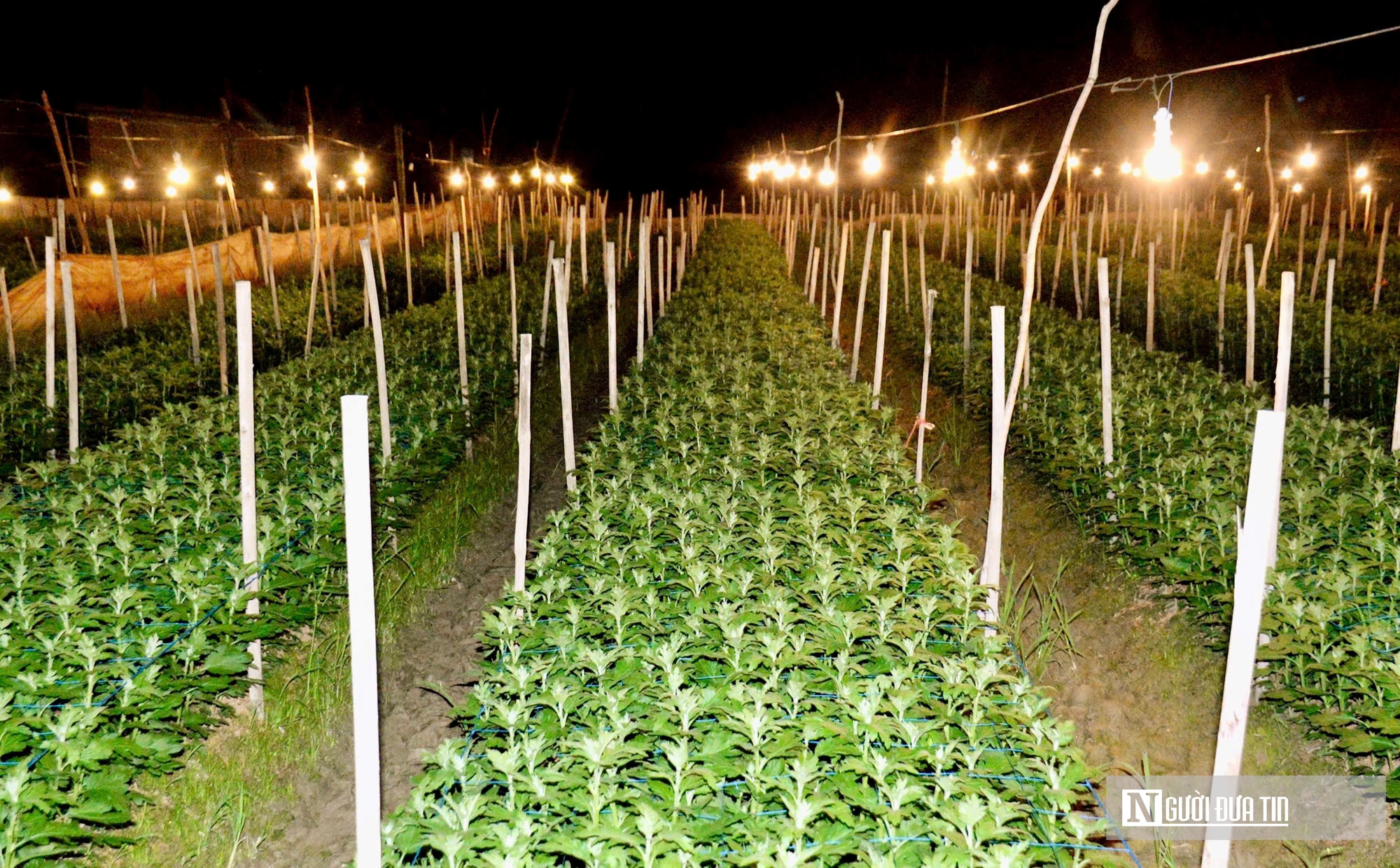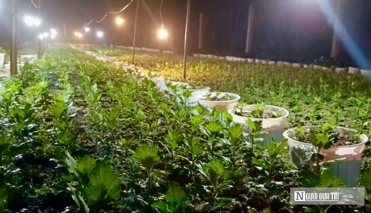 Để kịp có “hàng” tiêu thụ dịp Tết, từ khi hoa cúc bén rễ các nhà vườn đã phải chong đèn liên tục 10 ngày để thân phát triển tốt, tránh tình trạng cây bị thấp lùn.