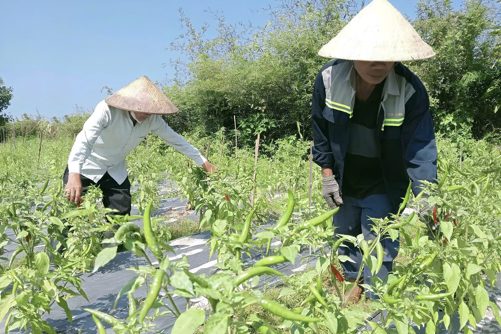 Nông dân canh tác trên cánh đồng Vĩnh Đại với mô hình trồng ớt chỉ thiên. Ảnh: HOÀNG ĐẠO