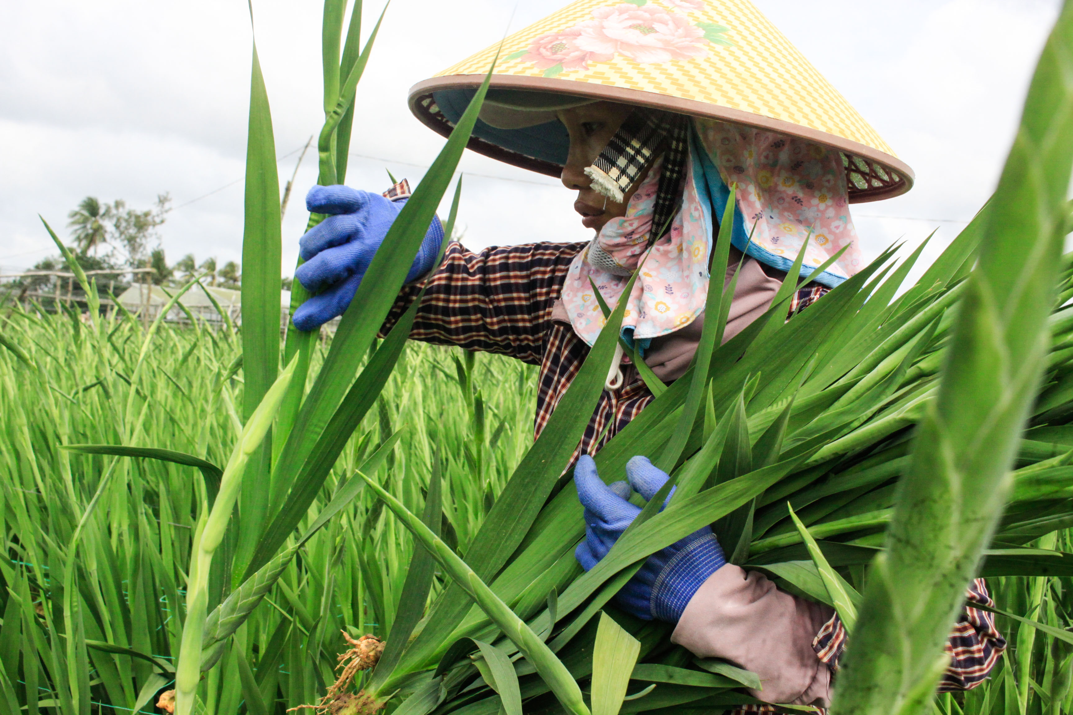 Người dân đang thu hoạch hoa lay ơn. Ảnh: NGUYỄN TRANG