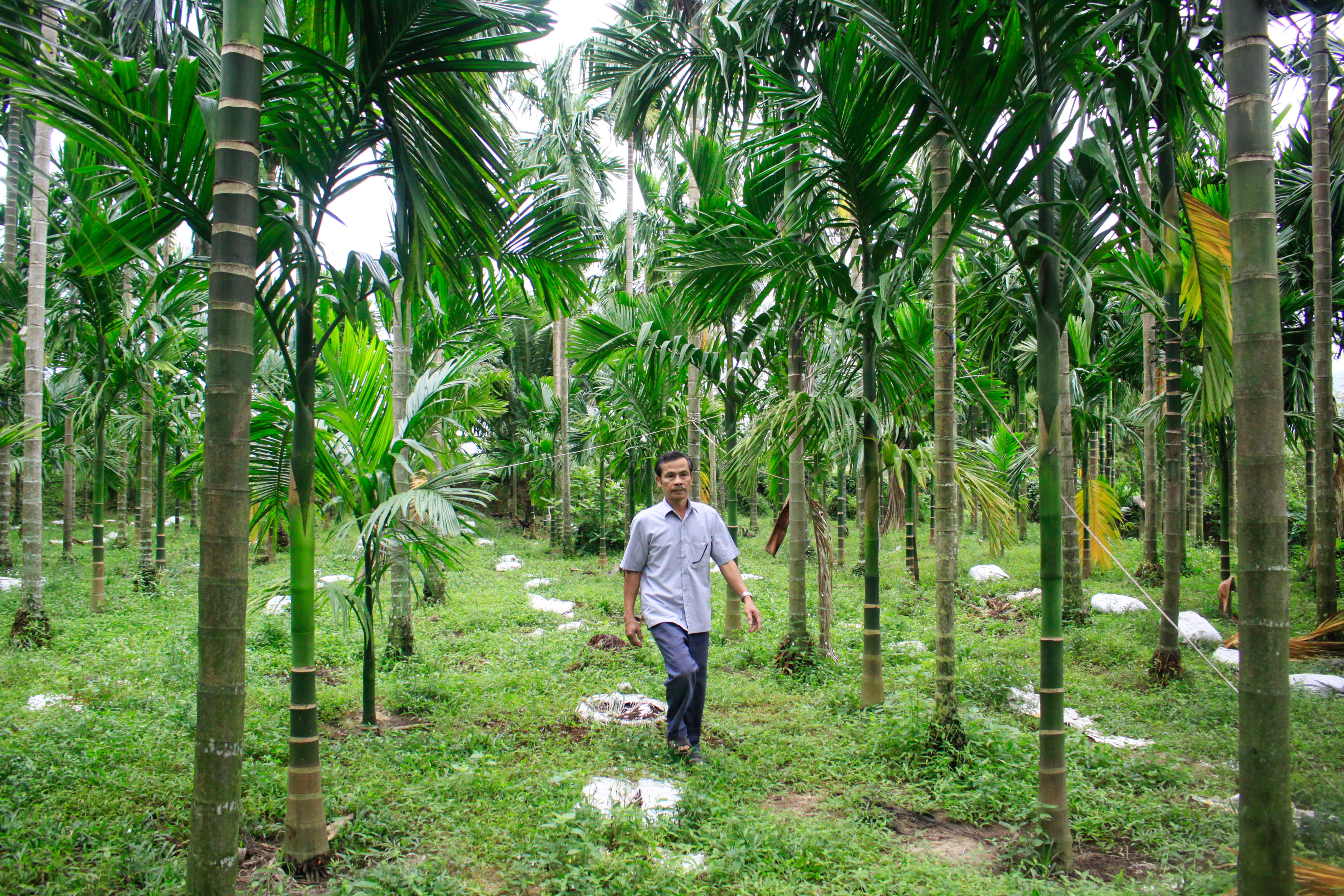 Không chỉ sản xuất giỏi, ông Nhẫn còn là người tiên phong trong việc áp dụng khoa học kỹ thuật vào nông nghiệp. Tại vườn cau, ông lắp đặt hệ thống tưới tự động tiết kiệm nhân công. Với những vùng đất khô cằn, cây sinh trưởng kém, ông chủ động để cỏ phát triển tự nhiên, tạo mùn, giữ ẩm và cải thiện độ tơi xốp cho đất.