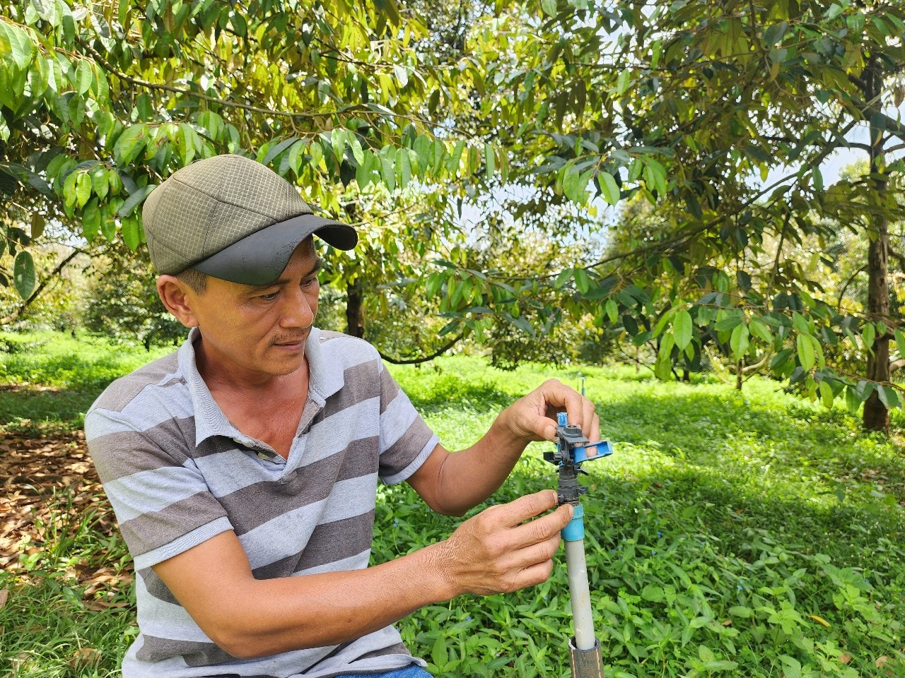 Vì vậy, mỗi năm khi mùa khô đến, gia đình anh đều dành nhiều thời gian để chăm sóc vườn cây, từ việc kiểm tra máy móc đến điều chỉnh lịch tưới sao cho phù hợp với tình hình thời tiết.