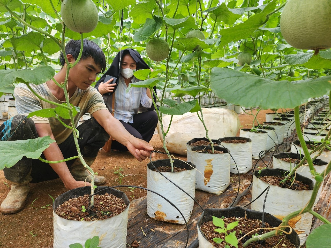 Nông dân xã Quảng Khê đầu tư hệ thống tưới phun sương để tiết kiệm nước chăm sóc dưa lưới