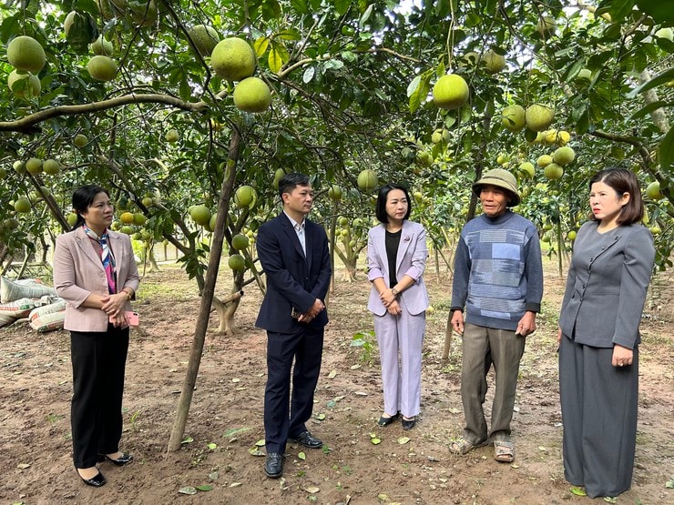 Phó Chủ tịch Hội Nông dân thành phố Hà Nội Trương Văn Nhung cùng đoàn công tác tham quan mô hình phát triển kinh tế được hỗ trợ vay vốn từ nguồn Quỹ Hỗ trợ nông dân. Ảnh: Vân Anh