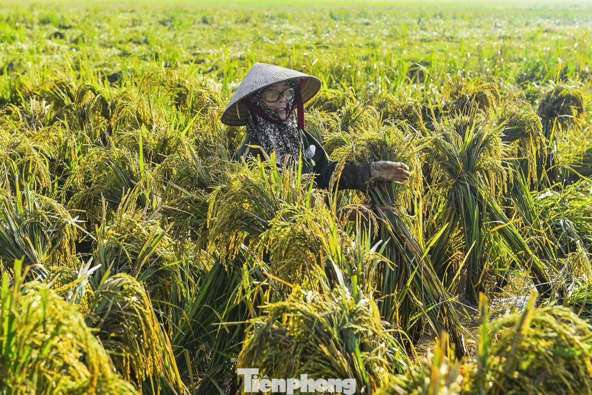 Lo lúa nảy mầm, hư hỏng hoàn toàn, người dân tranh thủ nắng ráo ra đồng để thu hoạch.