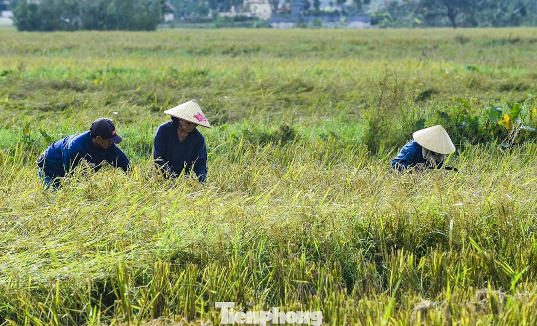 Những đồng nước sâu, lúa bị ngã, người dân tranh thủ gặt tay, vớt vát từng bông lúa ngả màu về cho gia cầm.