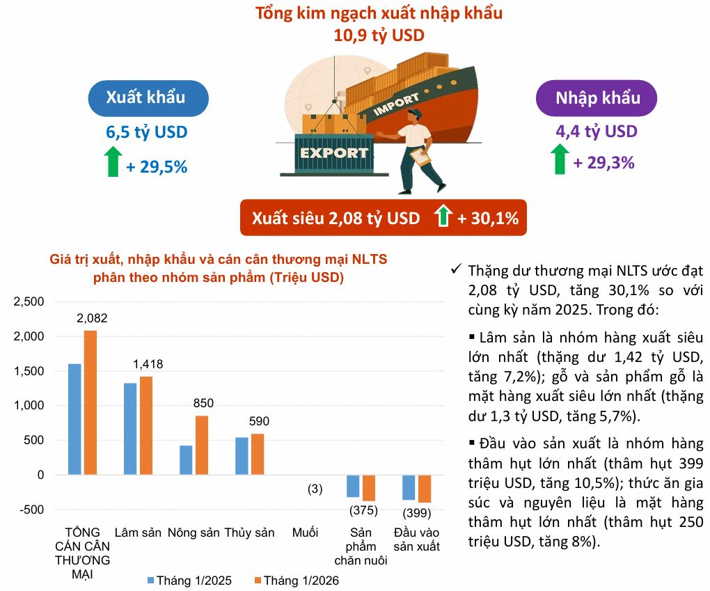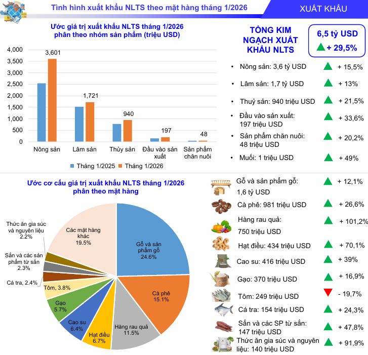 Tổng kim ngạch xuất khẩu NLTS tháng 1/2026 đạt khoảng 6,51 tỷ USD. Đóng góp lớn nhất là nhóm hàng nông sản với 3,6 tỷ USD (tăng 41,8%), tiếp theo là lâm sản đạt 1,72 tỷ USD (tăng 13%) và thủy sản đạt 940 triệu USD (tăng 21,5%).