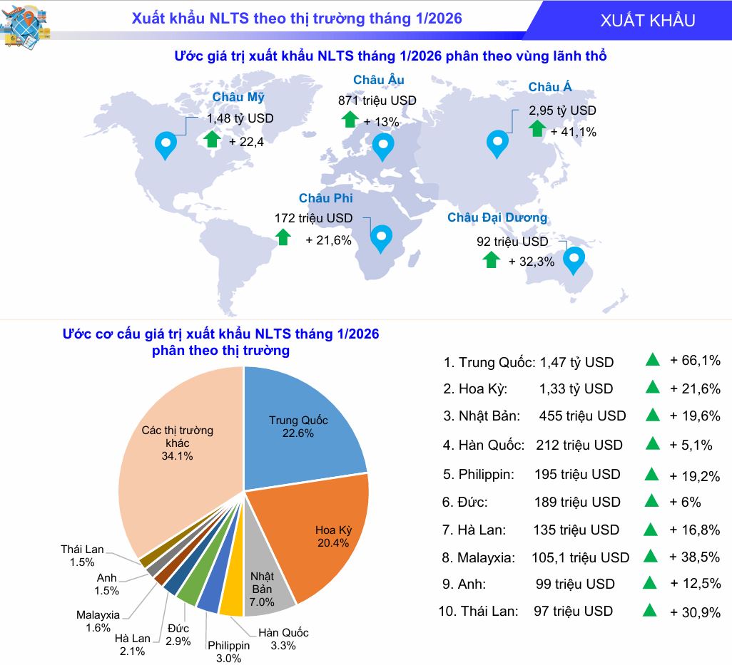 Ước giá trị xuất khẩu NLTS tháng 1/2026 phân theo vùng lãnh thổ.