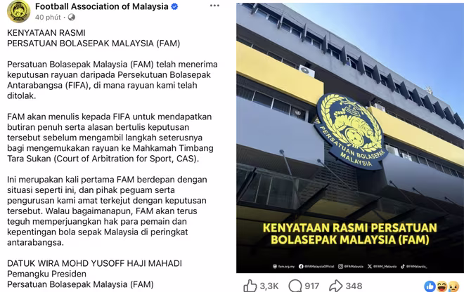 Trong thông báo phát đi lúc 21h10, FAM cho biết đã nhận được FIFA thông báo về việc bác kháng cáo án phạt do Ủy ban Kỷ luật FIFA ban hành hôm 26-9.