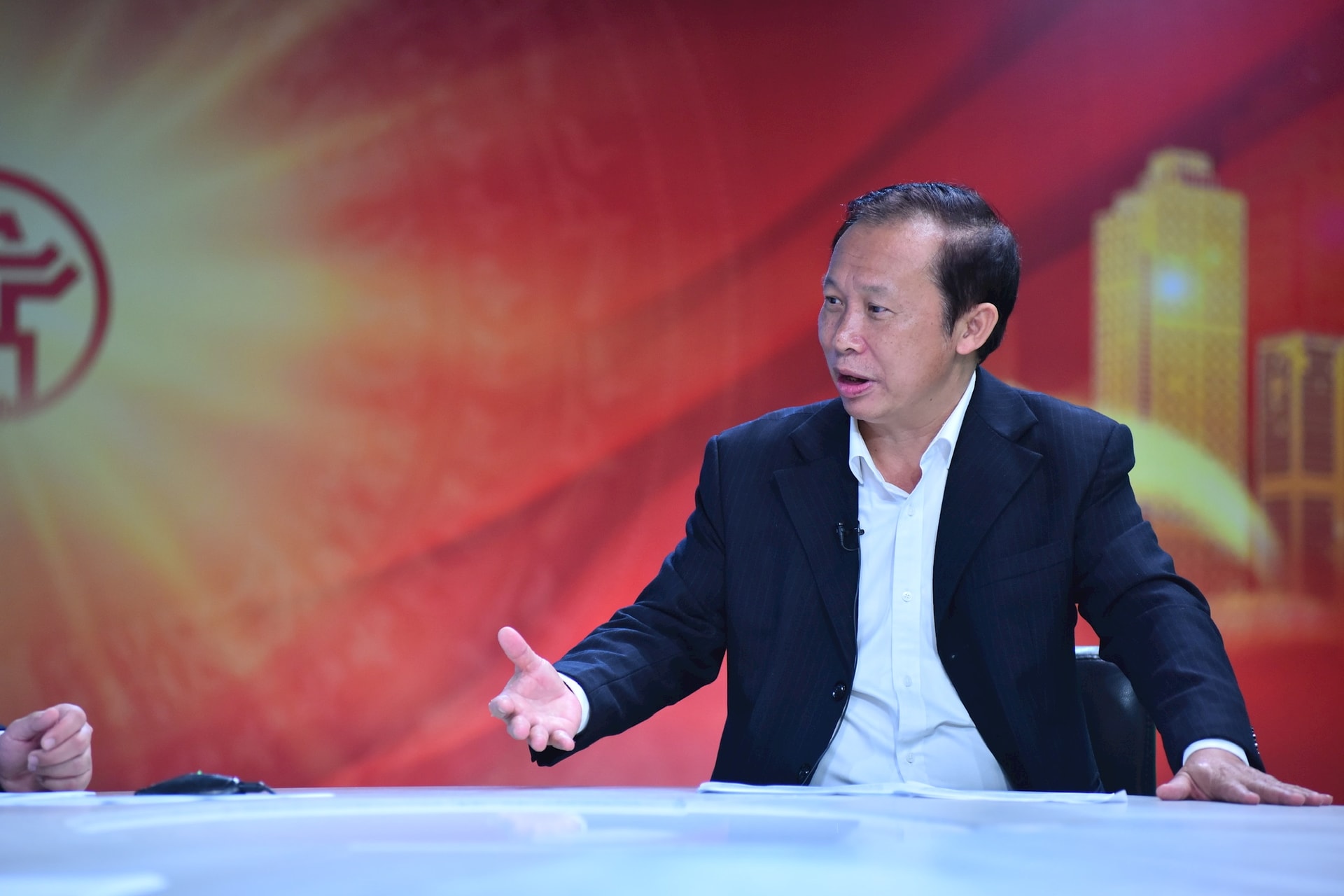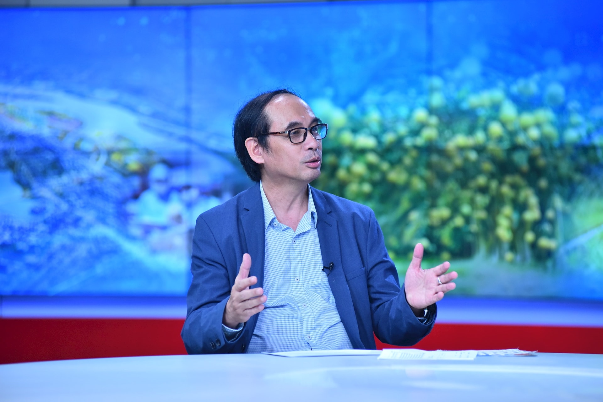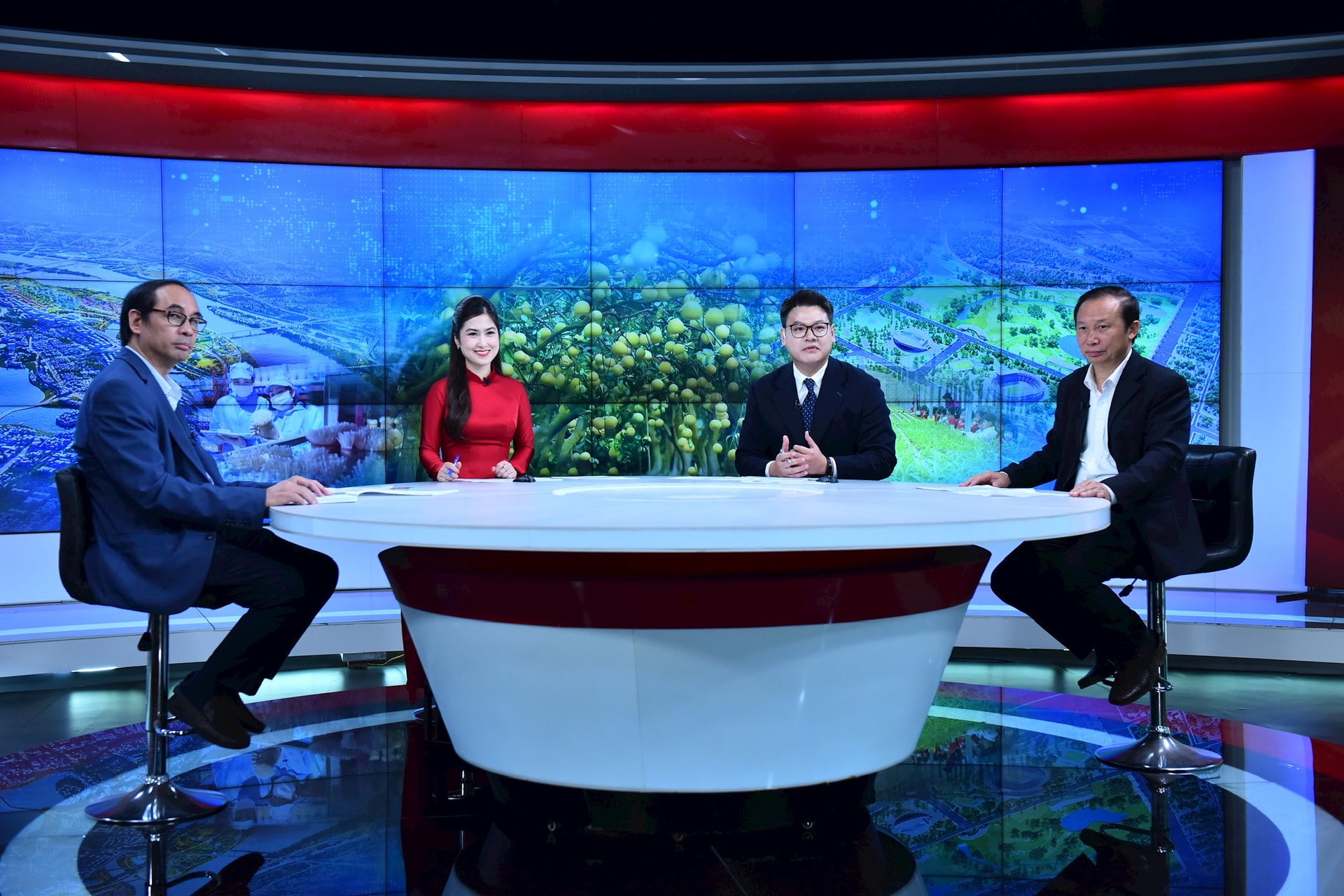 PGS.TS. Đào Thế Anh (ngoài cùng phía trái màn hình) và PGS.TS Đặng Văn Đông (ngoài cùng phía phải màn hình) trao đổi về chủ đề Phát triển nông nghiệp đô thị - Thay đổi tư duy trong kỷ nguyên mới trong Chương trình thời sự đặc biệt tối 3-4 của Cơ quan Báo và Phát thanh, Truyền hình Hà Nội. Ảnh: Phan Anh