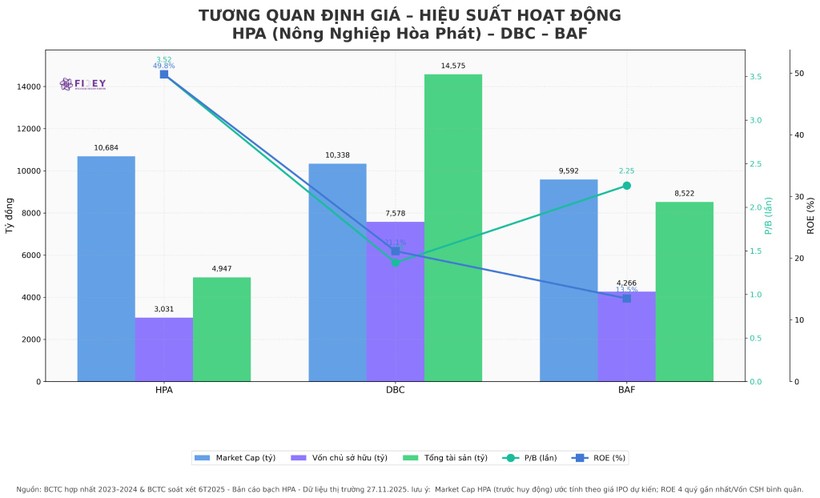 Tuy nhiên, xét về quy mô tổng tài sản, HPA vẫn khiêm tốn hơn đáng kể: Cuối quý III/2025, tổng tài sản công ty ở mức khoảng 4.518 – 4.519 tỷ đồng, trong khi DBC sở hữu hơn 15.500 tỷ, BAF khoảng 9.600 tỷ, và một số doanh nghiệp khác còn cao hơn.