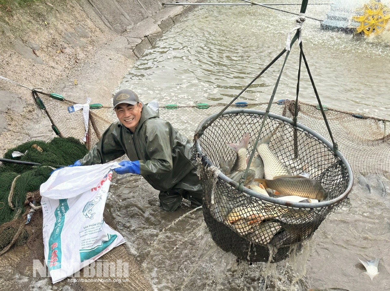 Niềm vui thu hoạch của nông dân nuôi cá xã Gia Viễn. Ảnh: Nguyễn Lựu