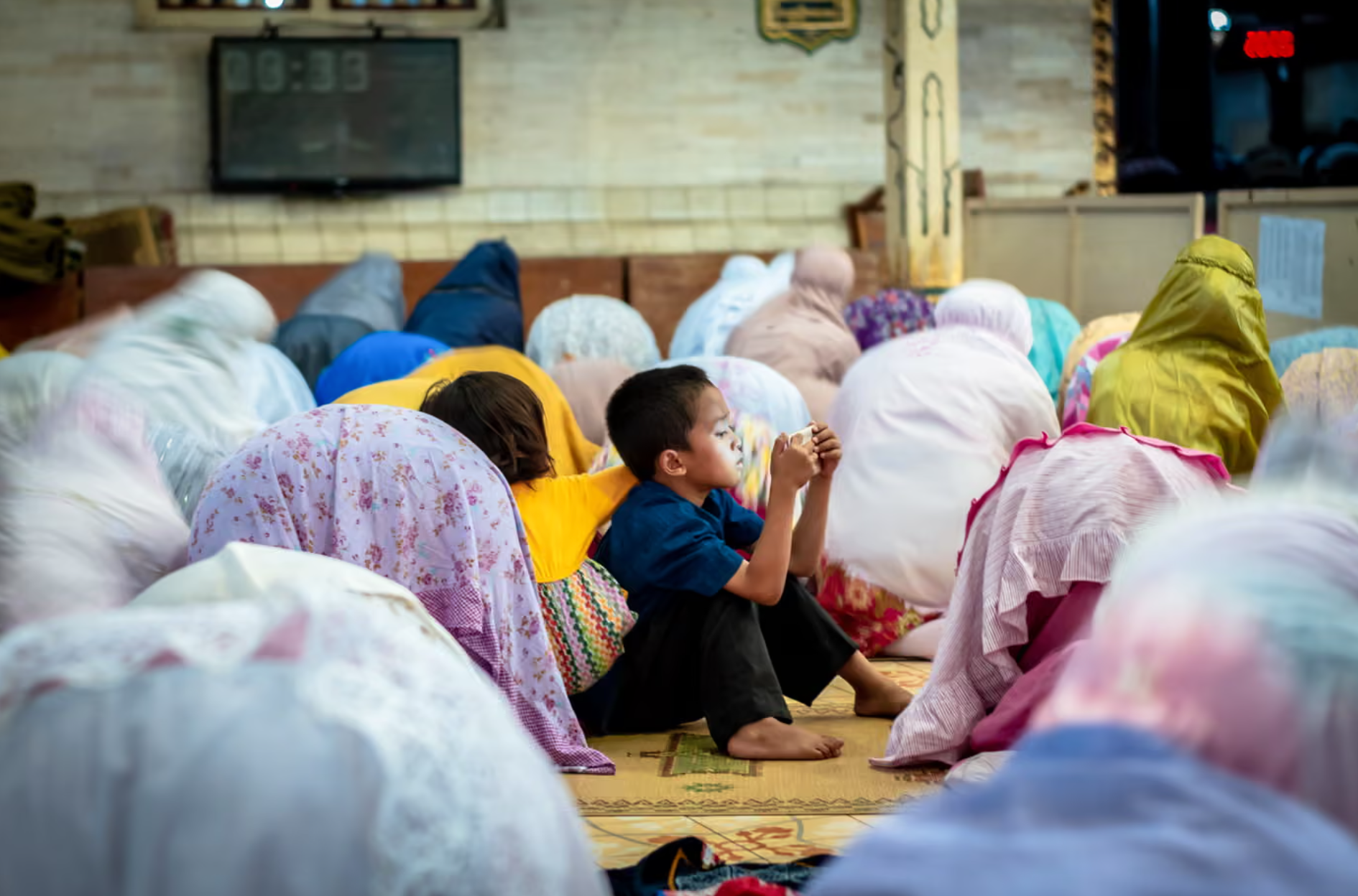 Một em bé đang chơi điện thoại thông minh tại Thánh đường Hồi giáo Kauman ở Yogyakarta, Indonesia. Ảnh: NurPhoto