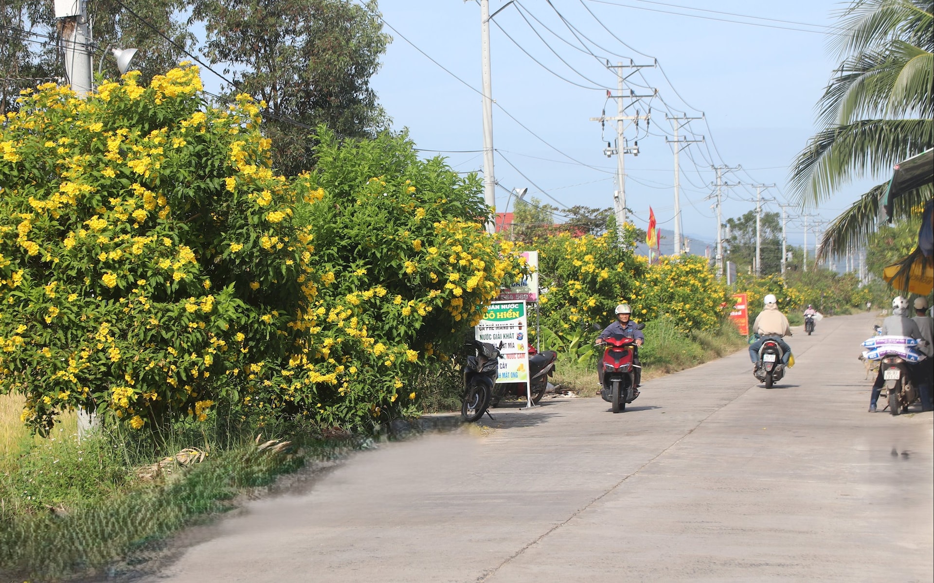 Tuyến đường vào thôn Suối Đá, xã Hồng Sơn rực rỡ sắc màu của hoa hoàng yến, một khung cảnh làng quê yên bình.