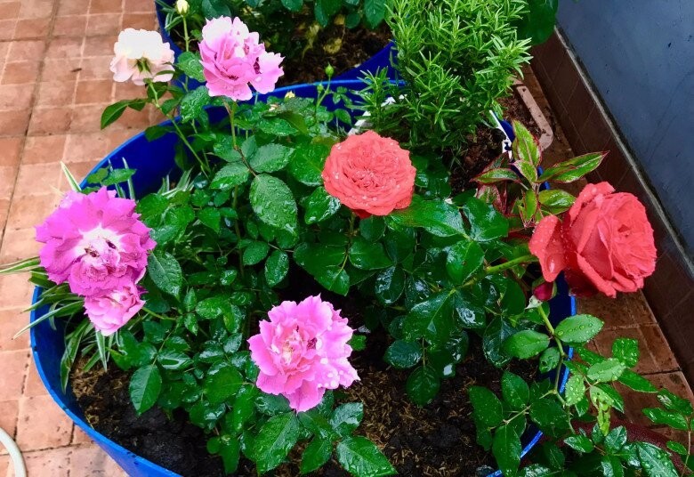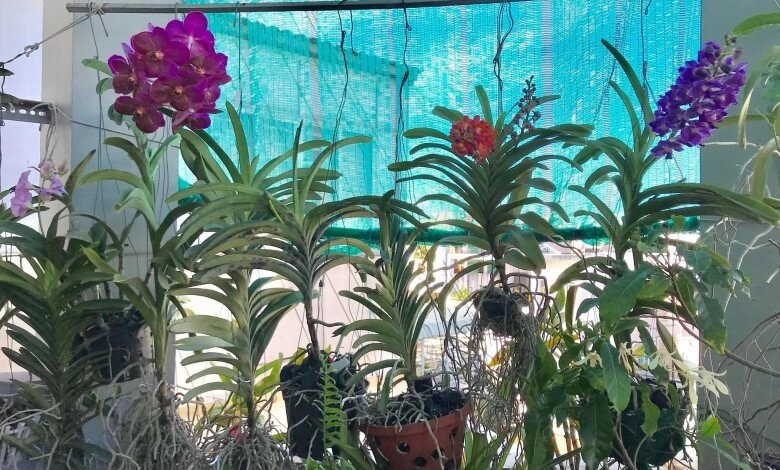 Ông khéo léo tận dụng những chiếc thùng nhựa xanh lớn, biến chúng thành những chậu trồng hồng độc đáo. Những giò lan cũng rực rỡ không kém.