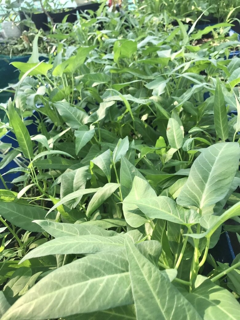 Bên cạnh đó, các loại rau ăn lá như cải xanh, rau muống, xà lách tươi non, mơn mởn trong các khay nhựa được sắp xếp khoa học càng làm phong phú thêm cho "thực đơn" hàng ngày của gia đình.