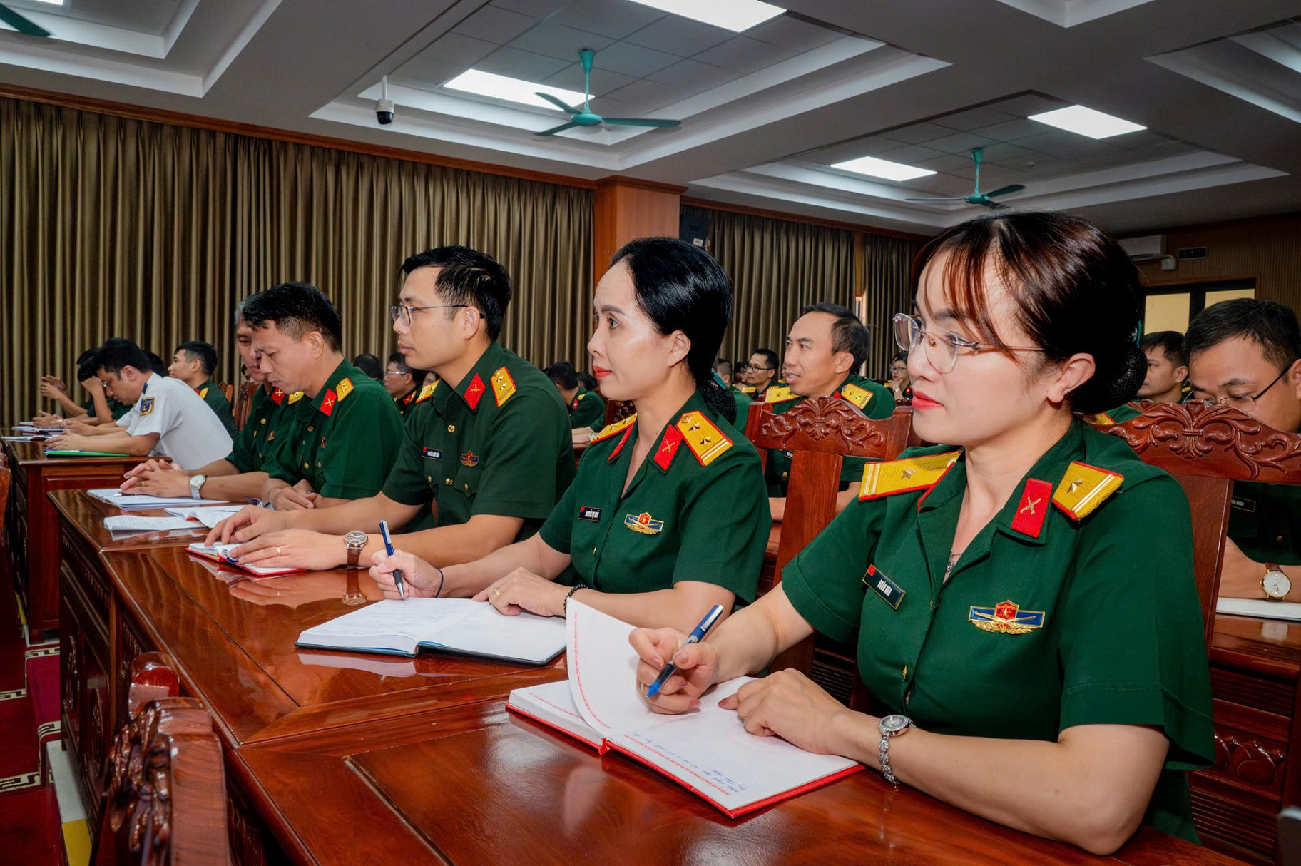 Thiếu tá Đoàn Nga (ngoài cùng bên phải) trong giờ học tập trên giảng đường. Ảnh: TRUNG THÀNH