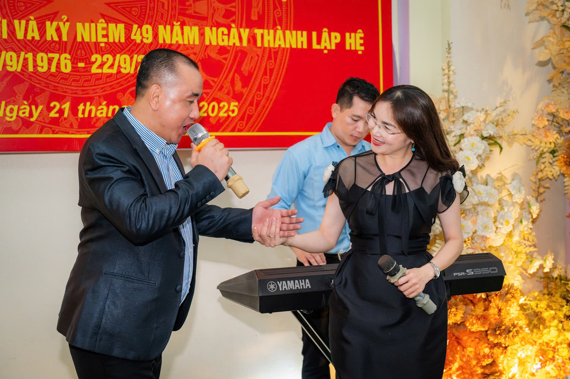Nghệ sĩ Đoàn Nga hát song ca với học viên đến từ Quân đội nhân dân Lào trong buổi gặp mặt kỷ niệm 49 năm Ngày truyền thống Hệ 4, Học viện Chính trị.