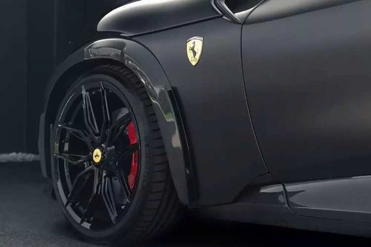 Một số chi tiết bổ sung có lớp sơn đen bóng, màu sắc này cũng được thêm vào bộ mâm nan chữ Y mới. Bộ kẹp phanh màu đỏ phía sau, cùng với logo Ferrari, bao gồm cả biểu tượng hình khiên gắn trên chắn bùn trước, tạo nên một chút tương phản cho cỗ máy bí ẩn này.