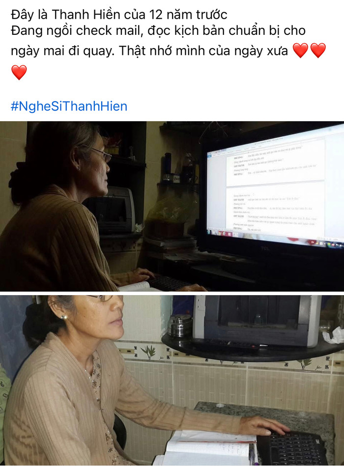 Khoảnh khắc được nữ nghệ sĩ chia sẻ được cho là ghi lại thời điểm cách đây hơn một thập kỷ. Khi ấy, NSND Thanh Hiền vẫn miệt mài với kịch bản, công việc hậu trường và những buổi chuẩn bị âm thầm trước giờ ghi hình hay biểu diễn.