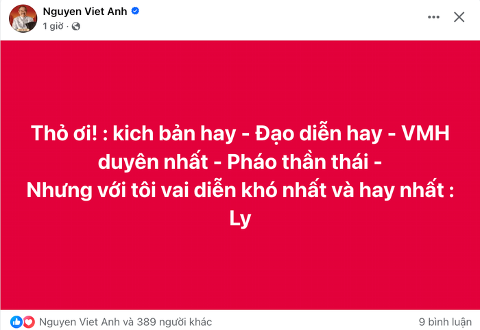 Dòng trạng thái không dài nhưng cho thấy cách nhìn tổng thể của một nghệ sĩ nhiều kinh nghiệm đối với dự án điện ảnh đang được chú ý. Trong đó, NSND Việt Anh đánh giá cao kịch bản và vai trò cầm trịch của đạo diễn Trấn Thành, đồng thời ghi nhận sự duyên dáng của Văn Mai Hương và thần thái diễn xuất của Pháo. Đáng chú ý, theo cảm nhận cá nhân của nam nghệ sĩ, nhân vật do Lyly đảm nhận là vai diễn khó nhất nhưng cũng là hay nhất của bộ phim.