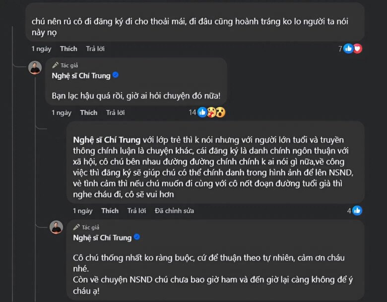 Đáng chú ý, một số khán giả khuyên anh nên đăng ký kết hôn để tránh những lời đàm tiếu và coi đây là điều kiện cần thiết để hình ảnh trở nên "chính danh" khi xét tặng danh hiệu NSND. Đáp lại, Chí Trung khẳng định quan điểm này đã cũ và bản thân anh cùng bạn gái đã thống nhất không ràng buộc pháp lý, để mọi thứ thuận theo tự nhiên.